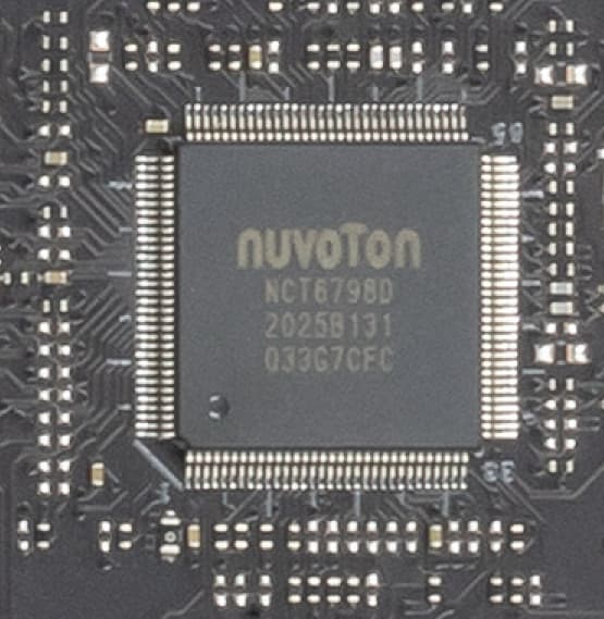 За мониторинг состояния платы отвечает, а также контролирует работу всех гнезд СО (а также в целом Multi I/O) контроллер Nuvoton NCT6798D.