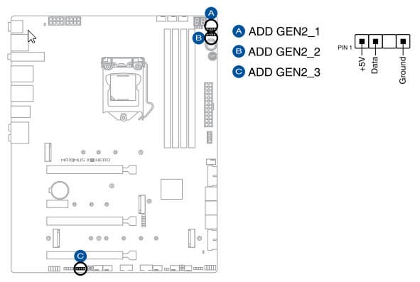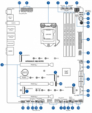 Теперь про блок ввода-вывода, разъемы для подключения вентиляторов и т. п. Разъемов для подключения вентиляторов и помп на самой плате — 8. Схема размещения коннекторов для систем охлаждения выглядит так: