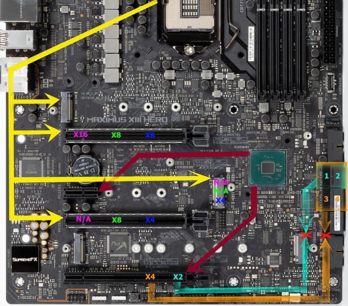 - Слот PCIe x16_1 имеет 8 линий, слот PCIe x16_2 имеет 4 линии, порт М2_2 имеет 4 линии