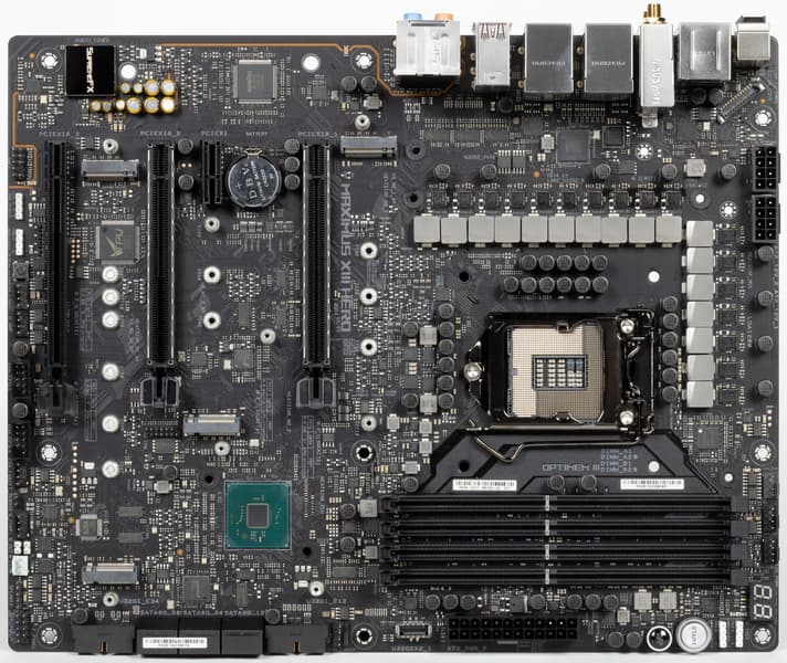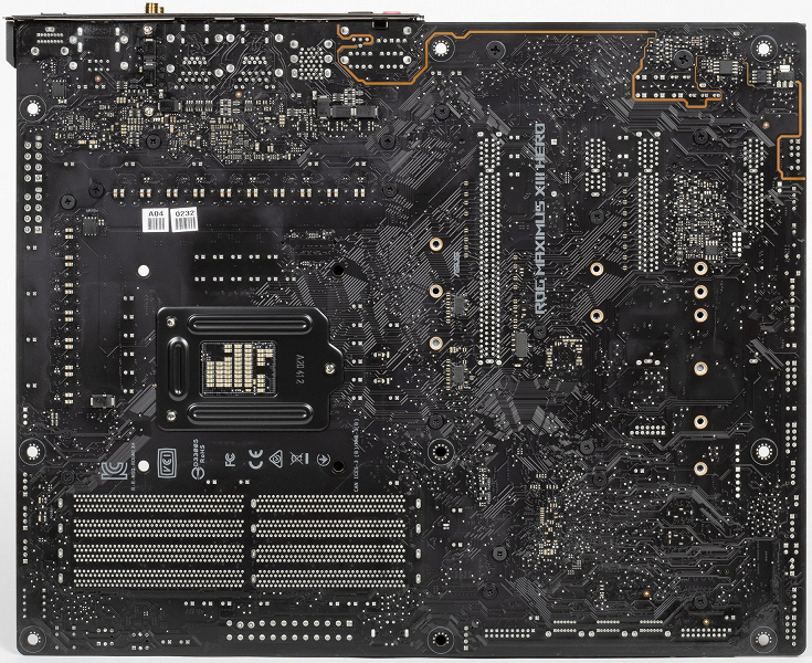 Форм-фактор ATX имеет размеры до 305×244 мм, а E-ATX — до 305×330 мм. Материнская плата Asus ROG Maximus XIII Hero имеет размеры 305×244 мм, поэтому выполнена в форм-факторе ATX, и на ней имеются 9 монтажных отверстий для установки в корпус. Однако следует иметь в виду, что одно из девяти монтажных отверстий перекрыто радиатором для слота M.2.