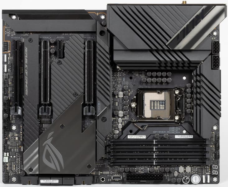 В арсенале платы также есть 6 портов SATA и 8 разъемов для вентиляторов. Система питания процессора традиционно для моделей ROG очень мощная, она способна обеспечить работу любых совместимых процессоров с запасом на разгон. Плата имеет грамотную систему охлаждения каждого потенциально греющегося элемента, включая накопители в слотах M.2 (термопрокладки для охлаждения накопителей есть с обеих сторон). Сетевые возможности прекрасные: два быстрых проводных контроллера 2,5 Гбит/с и один самый современный беспроводной. Поддержка Thunderbolt 4 позволяет передавать данные на скорости 40 Гбит/с. В числе плюсов платы можно упомянуть неплохую подсветку, включая широкие возможности для подключения дополнительных RGB-устройств. Отметим и улучшенный аудиокодек Realtek ALC4082.