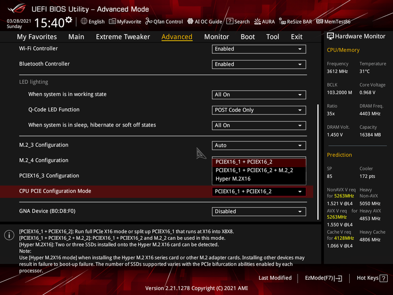 - Слот PCIe x16_1 имеет 8 линий, слот PCIe x16_2 имеет 8 линий (порт М2_2 отключен);