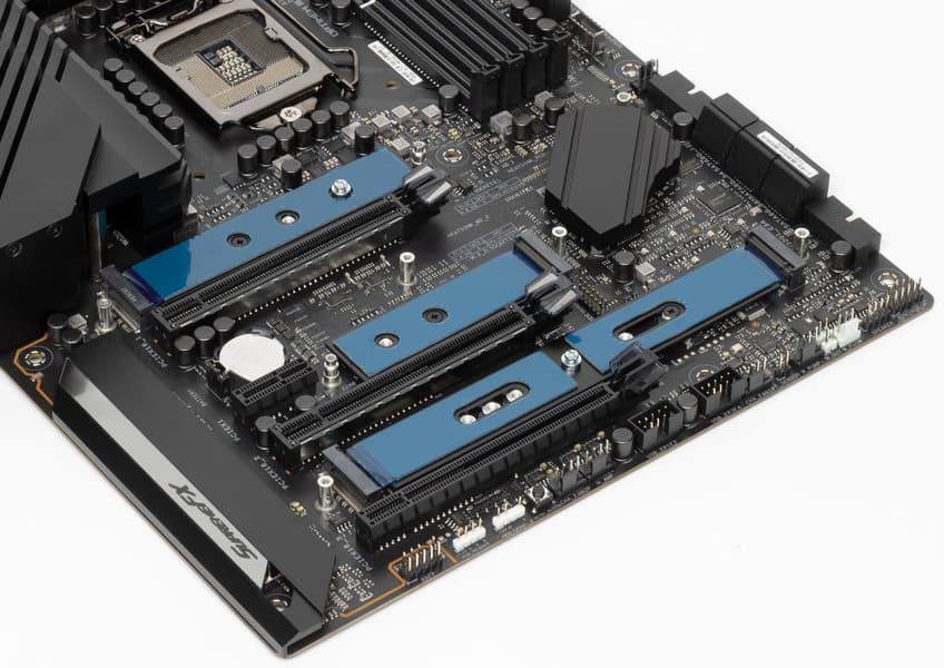 Все M.2 слоты имеют радиаторы. Верхние M2_1 и М2_2 обладают отдельными радиаторами, когда как остальные два нижних слота M.2 имеют общий радиатор.