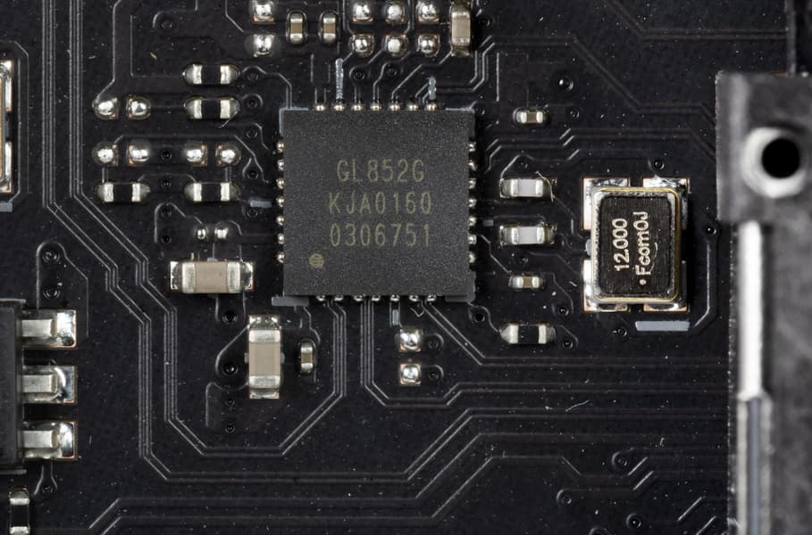 - 6 портов USB 2.0/1.1: 4 реализованы через контроллер Genesys Logic GL852G (на него потрачена 1 линия USB 2.0) и представлены двумя внутренними разъемами (каждый на 2 порта), еще 2 реализованы через Z590 и представлены на задней панели портами Type-A (черного цвета).