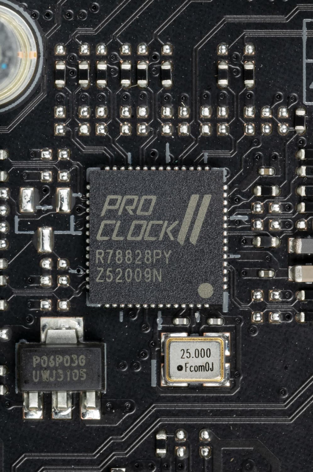 Для поддержания стабильных частот на шине PCIe (и для нужд оверклокеров) имеется внешний тактовый генератор неизвестного производителя, промаркированный Asus как ProClock II.