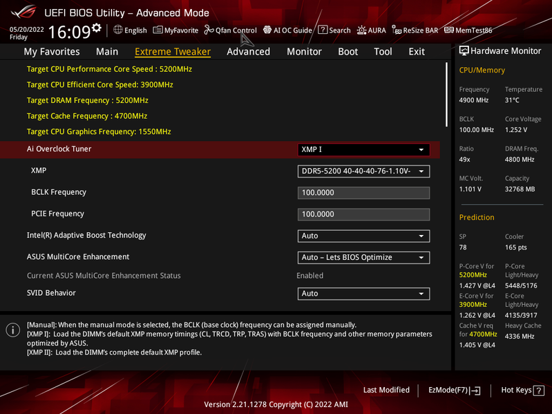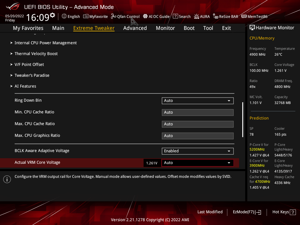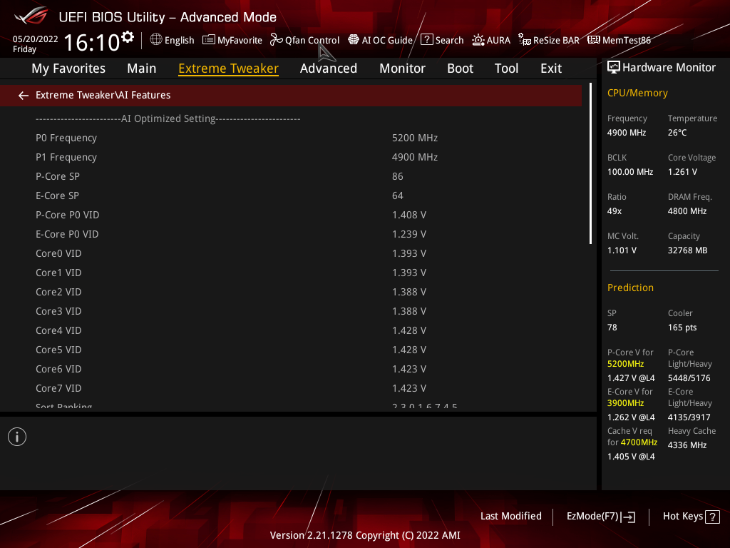 А теперь мы воспользуемся заложенной в BIOS опцией по умной оптимизации работы процессора и памяти, то есть включим AI Optimized (точно такого же можно достичь через программу AI Suite, не заходя в настройки BIOS). К сожалению, данная оптимизация лишь слегка подкорректировала ранее выставленный автооверклокинг, подняв частоту до 5,0 и 5,1 ГГц лишь на паре Р-ядер.