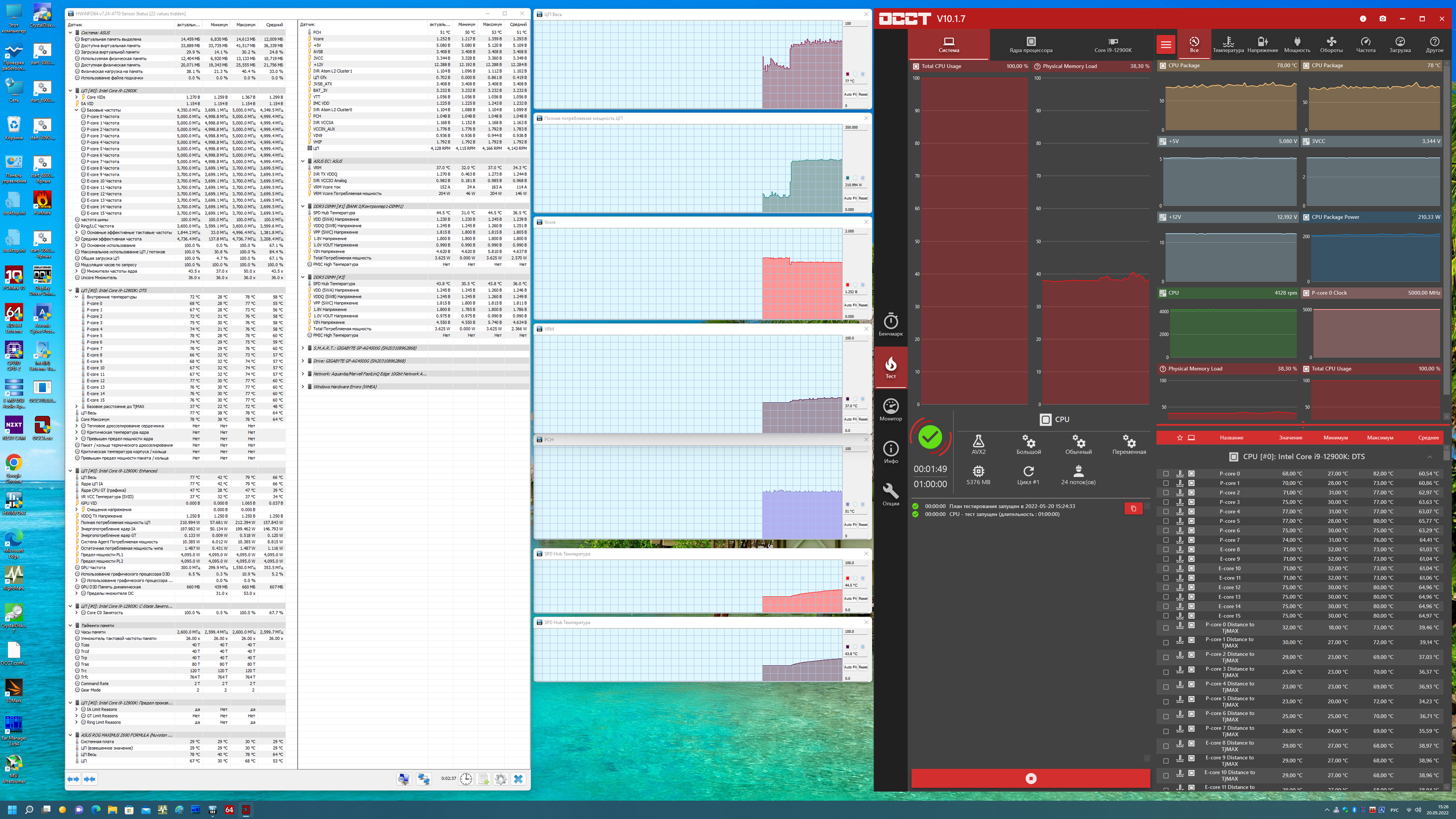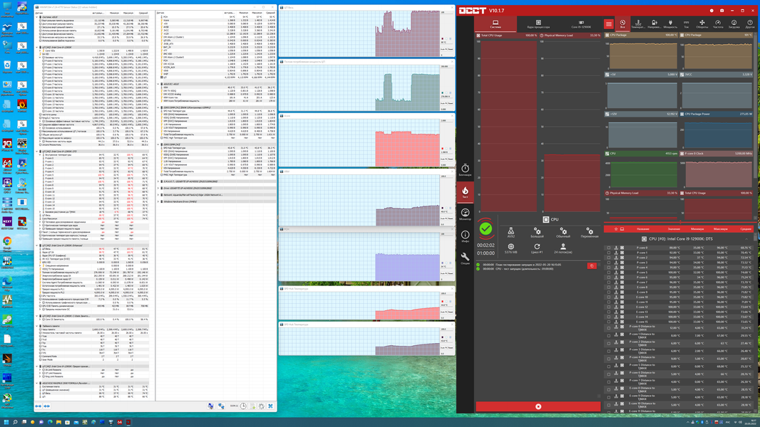 Теперь вручную выставим 5,1 ГГц по всем Р-ядрам. Энергопотребление процессора достигло 257 Вт! Нагрев VRM был небольшим (что логично ввиду наличия кастомной СВО), да и остальные элементы не особо грелись. Только сам процессор нагревался иногда до 100°С, однако на мгновение, троттлинга замечено не было. Вольтаж VCore изначально выставлялся чрезмерно высоким (1,44 В), но затем система его плавно снижала, обеспечивая неплохой баланс между нагревом и поддержкой высоких частот.