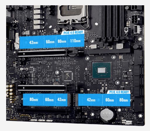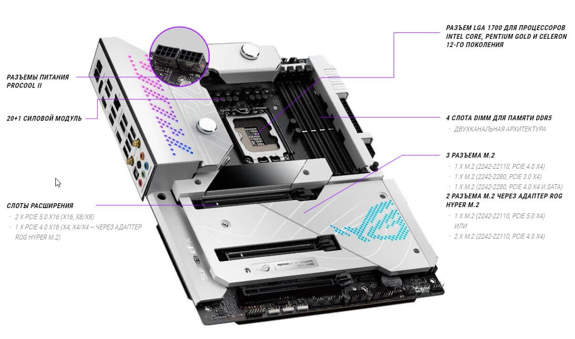 | Разъемы для накопителей | 6 × SATA 6 Гбит/с (Z690+ASMedia ASM1061) 1 × M.2 (CPU, PCIe 4.0 x4 для устройств формата 2242/2260/2280/22110) 1 × M.2 (Z690, PCIe 3.0 x4 для устройств формата 2242/2260/2280) 1 × M.2 (Z690, PCIe 4.0 x4/SATA для устройств формата 2242/2260/2280) 2 × M.2 (ROG Hyper M.2 card)(CPU/Z690, PCIe 4.0/5.0 x4 для устройств формата 2242/2260/2280/22110) |