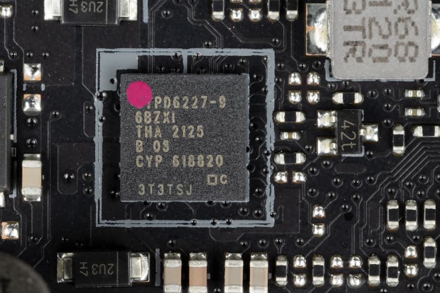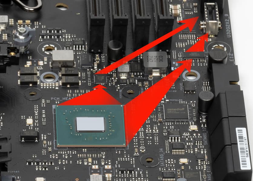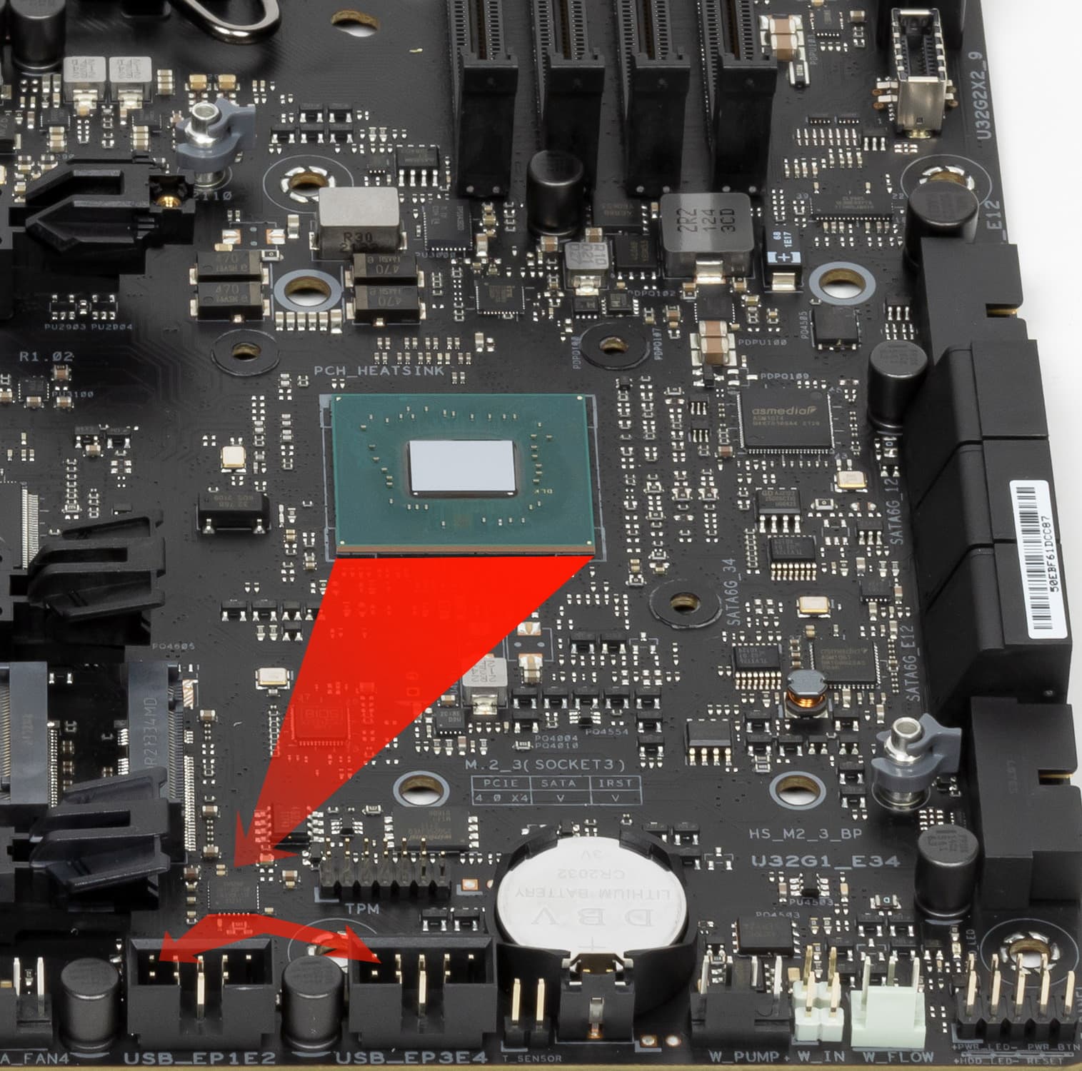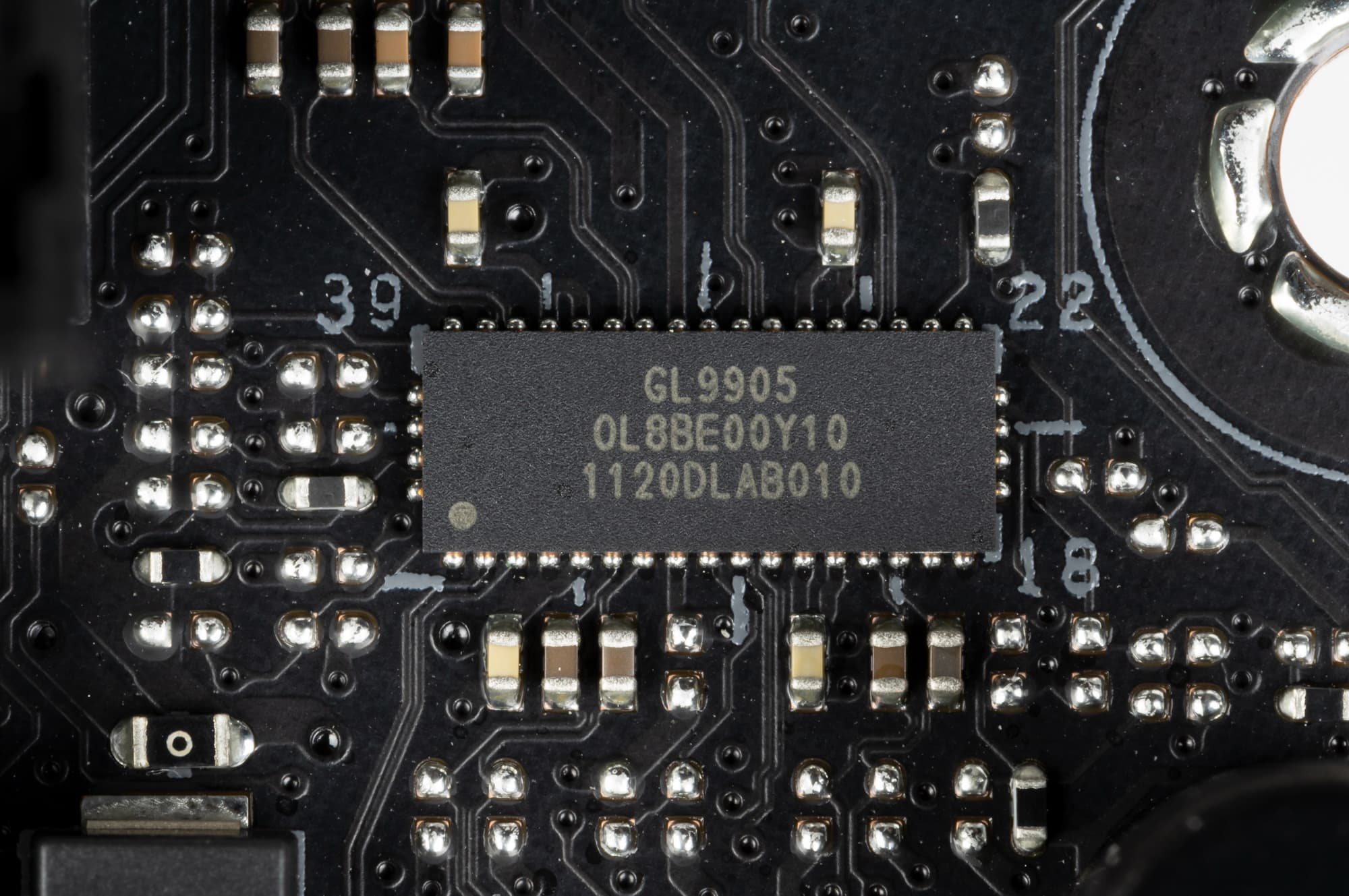 - 1 порт USB 3.2 Gen2x2: реализован с помощью двух хабов ITE IT8856 и Genesys Logic GL9905 и представлен внутренним портом Type-C (для подключения к соответствующему разъему на передней панели корпуса);