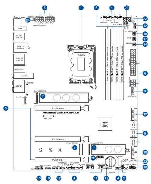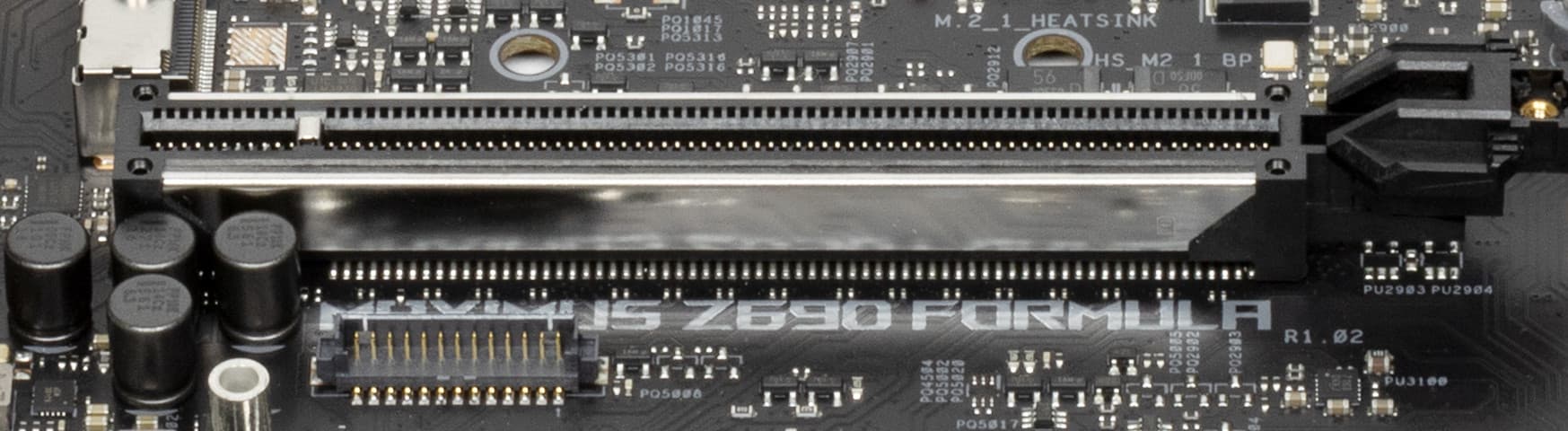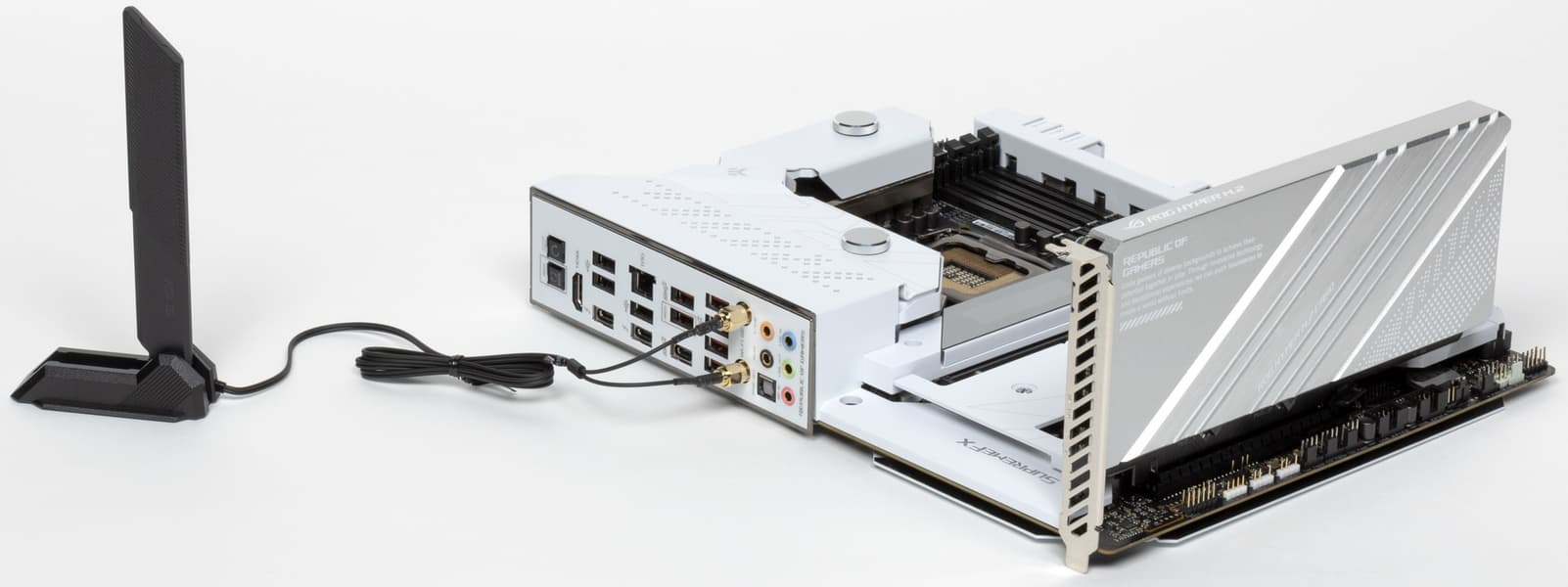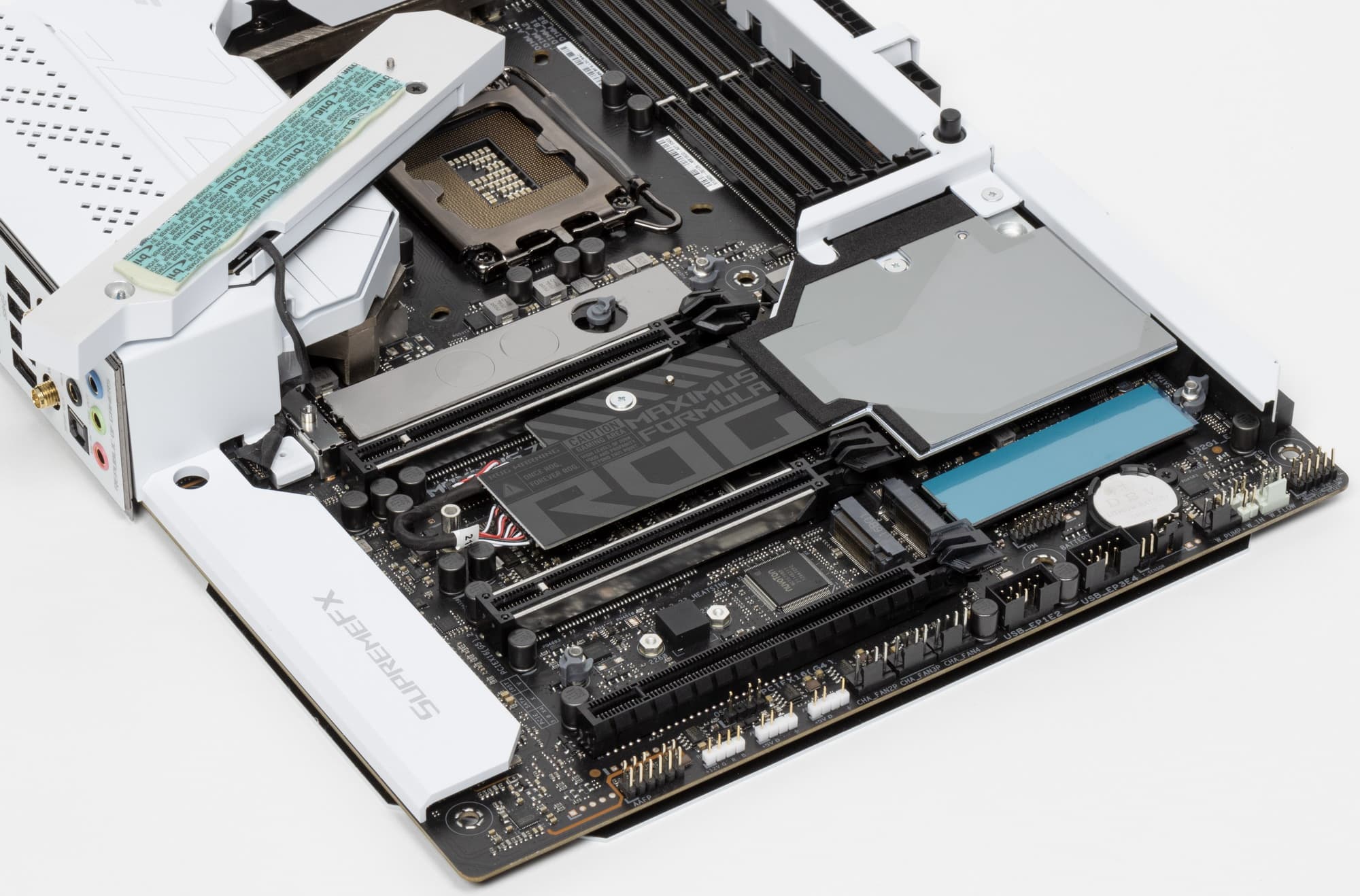 У Asus ROG Maximus Z690 Formula имеется 21 порт USB разных видов, включая 9 очень быстрых USB 3.2 Gen2, из которых два поддерживают Thunderbolt 4, а также один самый быстрый USB 3.2 Gen2×2 в виде внутреннего Type-C. Плата предлагает 3 слота PCIe х16, два из которых получают от процессора 16 линий PCIe, причем версии 5.0, а третий работает в режиме х4, и лишь с картой ROG Hyper M.2 возможен режим слота х4/х4. Также здесь аж 5 слотов M.2: 3 слота — на самой плате, один из них подключен напрямую к процессору линиями PCIe 4.0, два других подключены к чипсету Z690 линиями PCIe 4.0, а еще 2 слота М.2 находятся на карте расширения ROG Hyper M.2, которую можно использовать не только в третьем PCIe x16_3 (там будут работать одновременно оба слота), но и во втором PCIe x16_2, вследствие чего слот М.2_1 на карте ROG Hyper M.2 получит PCIe 5.0 от процессора, а значит, готов к установке SSD следующего поколения.