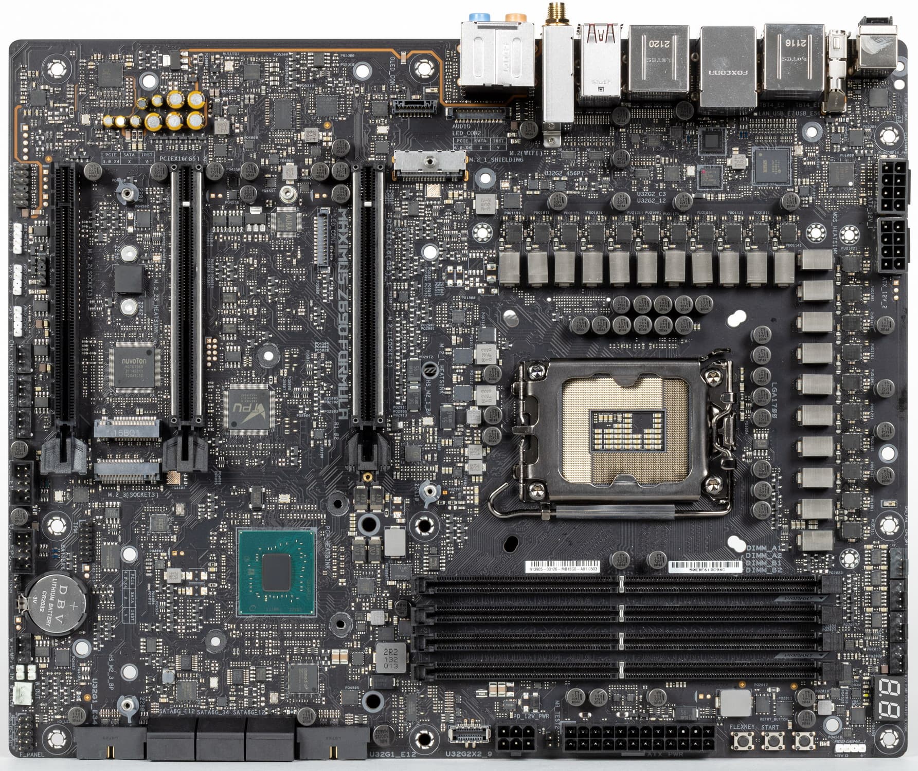 В арсенале платы также есть 6 портов SATA и 8 разъемов для вентиляторов. Система питания процессора очень мощная, она способна обеспечить работу любых совместимых процессоров с запасом на разгон. Плата имеет грамотную систему охлаждения каждого потенциально греющегося элемента, включая накопители в слотах M.2 (термопрокладки для охлаждения накопителей есть с обеих сторон). Стоит отметить наличие водоблока для охлаждения VRM, что позволяет данной плате считаться серьезным оверклокерским продуктом. Сетевые возможности прекрасные: очень быстрый проводной контроллер 10 Гбит/с и один самый современный беспроводной. Поддержка Thunderbolt 4 позволяет передавать данные на скорости 40 Гбит/с. В числе плюсов платы можно упомянуть неплохую подсветку, включая широкие возможности для подключения дополнительных RGB-устройств. Отметим и улучшенный аудиокодек Realtek ALC4082.