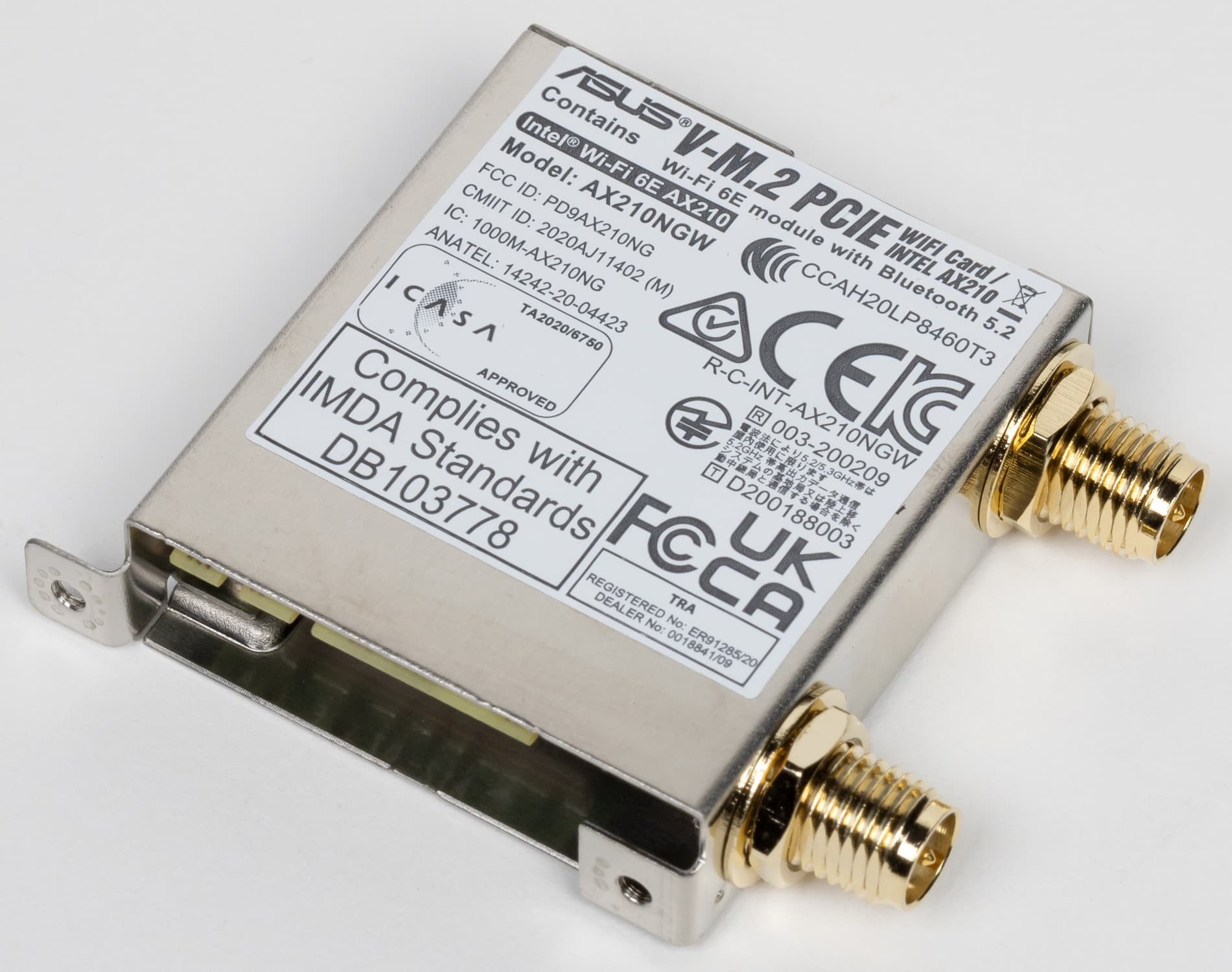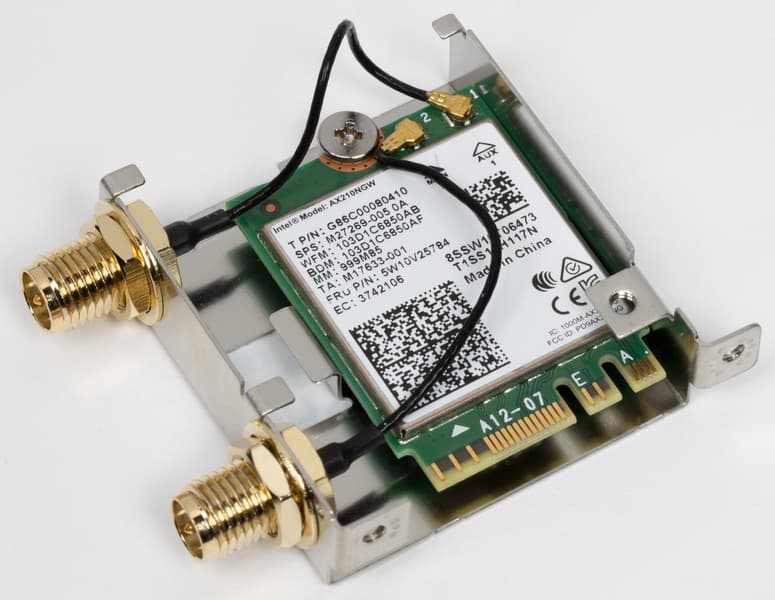 Имеется и комплексный беспроводной адаптер на контроллере Intel AX-210NGW, через который реализованы Wi-Fi 6E (802.11a/b/g/n/ac/ax) и Bluetooth 5.2. Он установлен в слот M.2 (E-key), и его разъемы для привинчивания выносных антенн выведены на заднюю панель.