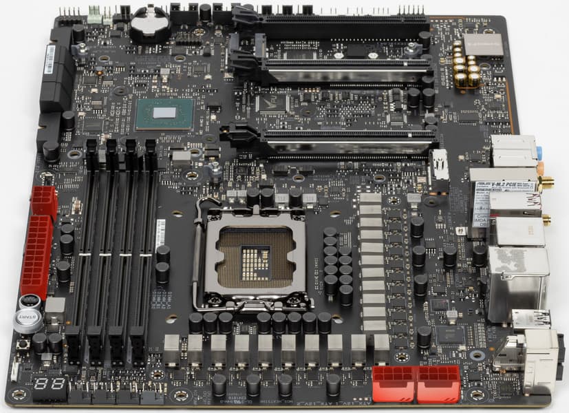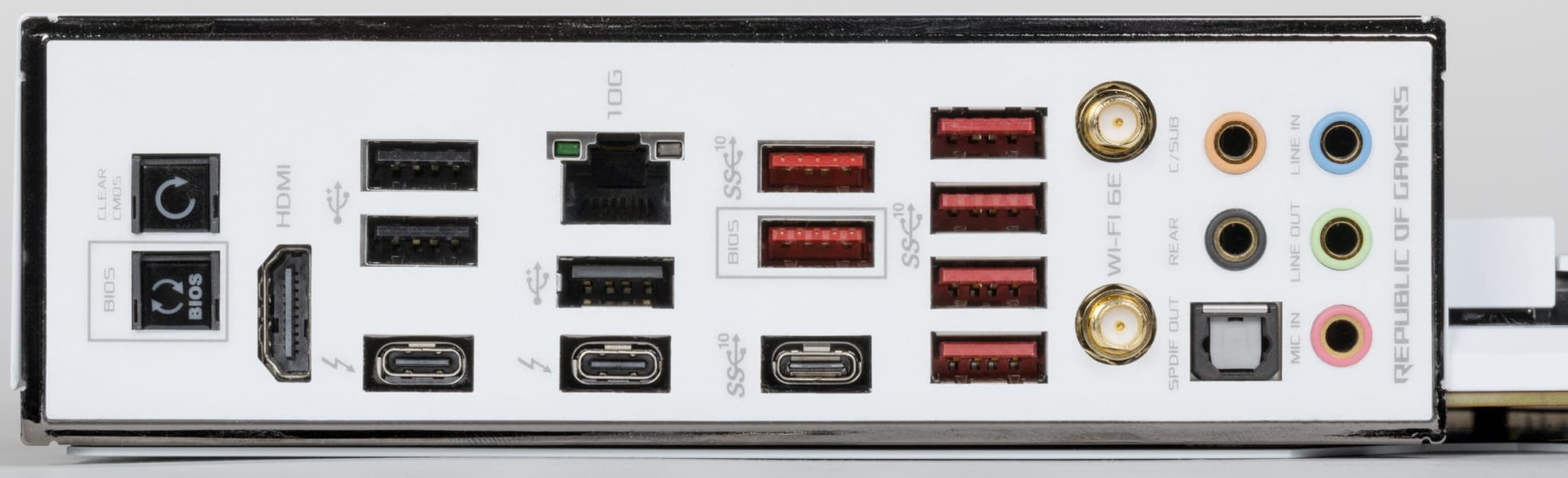 - 9 портов USB 3.2 Gen2: 7 реализованы через Z690 и представлены: 6 - на задней панели портами Type-A (красного цвета); 1 — на задней панели портом Type-C; остальные 2 реализованы через Thunderbolt 4 и также представлены на задней панели портами Type-C;