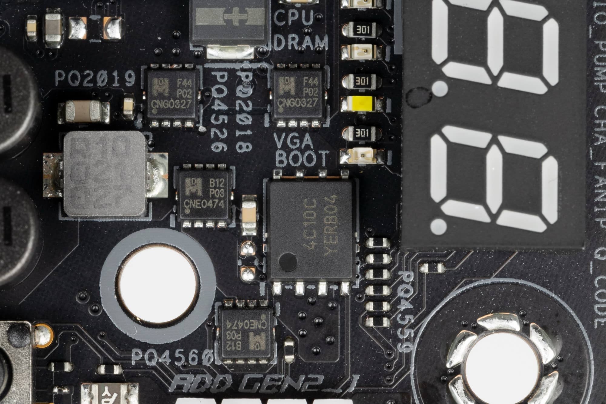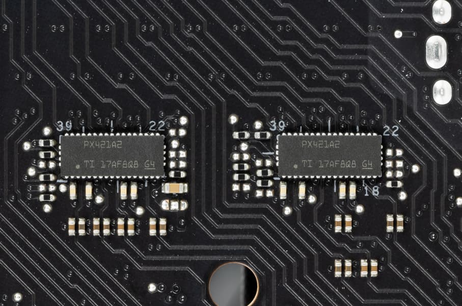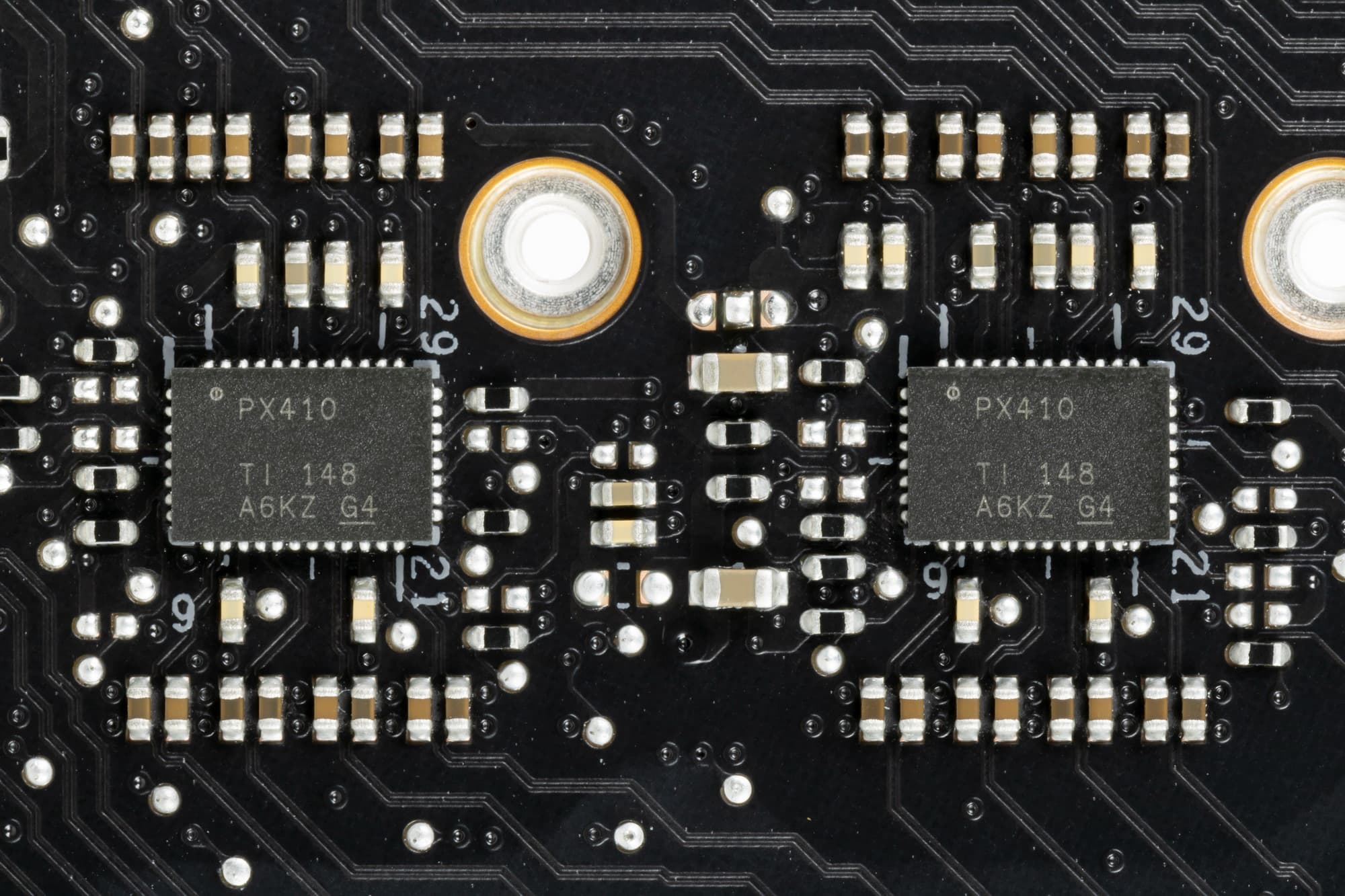 Как видим, перераспределение линий PCIe между слотами у этой материнки имеется, поэтому востребованы мультиплексоры PX421 от Texas Instruments (прежние мультиплексоры от Diodes не поддерживают PCIe 5.0).
