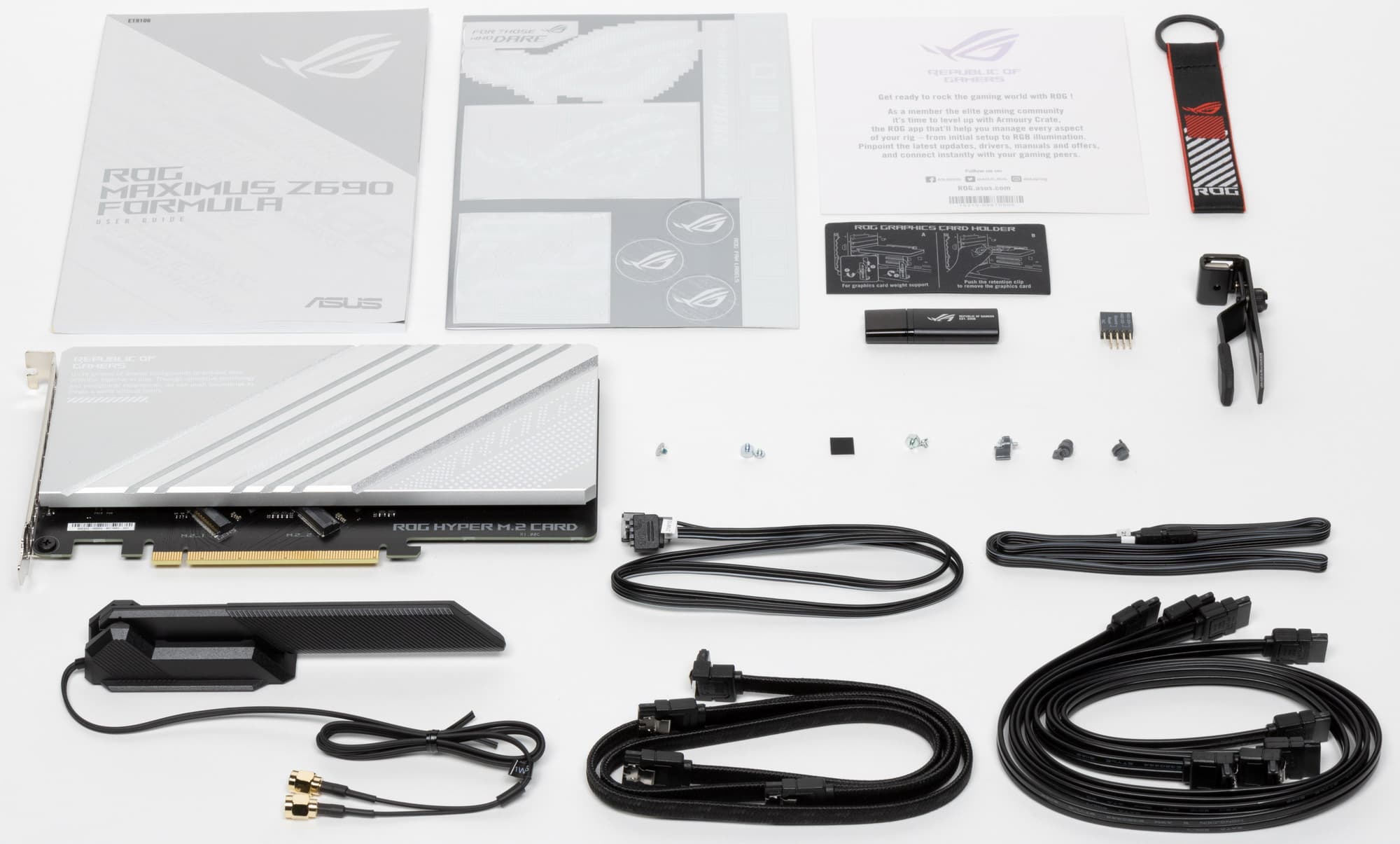 Комплект поставки соответствует флагманскому продукту: кроме традиционных элементов типа руководства пользователя и кабелей SATA, имеются антенна встроенного Wi-Fi-модуля, винтики для М.2 слотов, разветвители для подключения подсветок, фирменный адаптер для передней панели, бонусные стикеры, накопитель типа «флешки», брелок, подставка под видеокарту и ROG Hyper M.2 card (серого цвета, чтобы соответствовать общему дизайну).