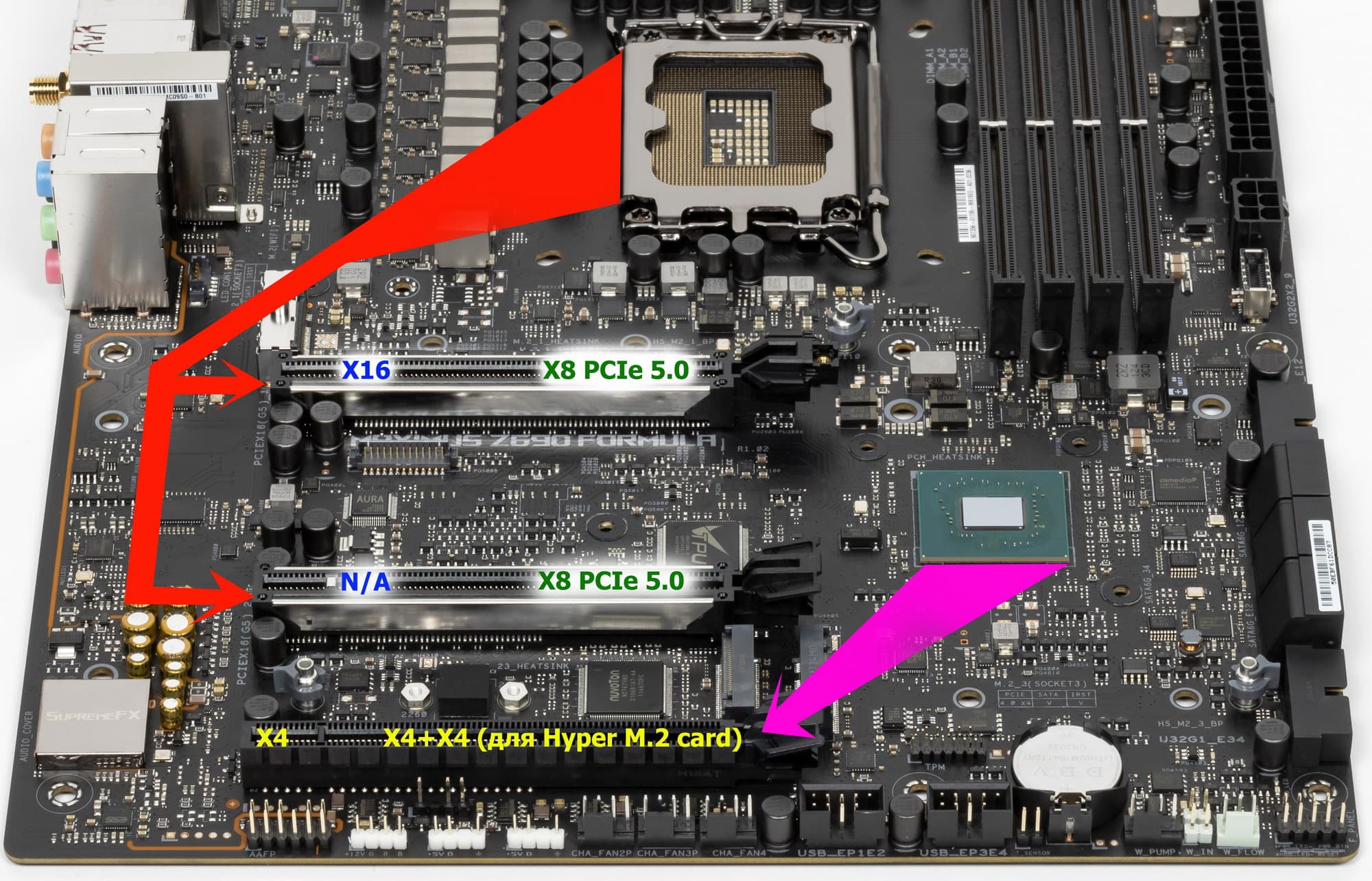 Теперь посмотрим выше на то, как работают процессоры в данной конфигурации. У CPU 12-го поколения всего 20 линий PCIe, 4 из них версии PCIe 4.0 отведены на порт М.2 (M2_1). Оставшиеся 16 линий PCIe 5.0 надо делить на два слота PCIe x16 (_1 и _2). Вариантов переключения несколько: