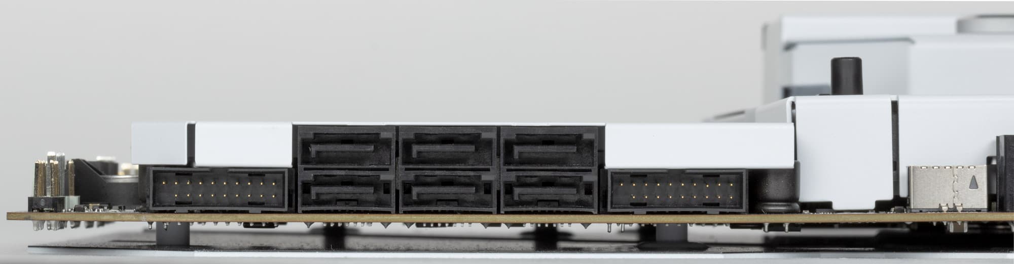 Всего у платы 6 разъемов Serial ATA 6 Гбит/с + 3 слота для накопителей в форм-факторе M.2. 4 порта SATA 1,2,3,4 реализованы через чипсет Z690 и поддерживают создание RAID.