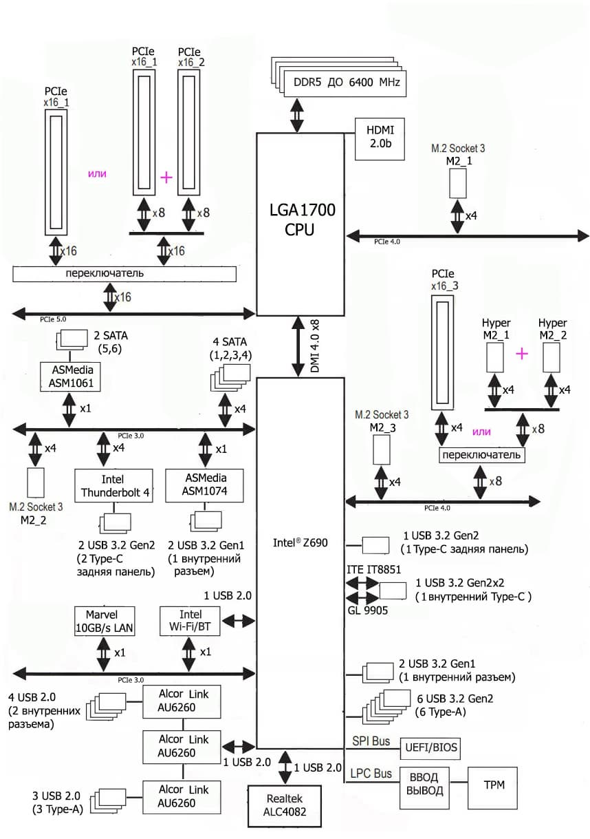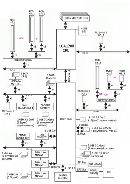 Процессоры Intel Core 12-го поколения (совместимые с сокетом LGA1700 и поддерживаемые Z690) имеют 20 линий ввода-вывода (16 PCIe 5.0, 4 PCIe 4.0), не имеют USB и SATA портов. При этом взаимодействие с Z690 идет по особому каналу Digital Media Interface 4.0 (DMI 4.0 x8). Все PCIe линии процессора идут на слоты расширения PCIe и порт М.2. Serial Peripheral Interface (SPI) используется для взаимодействия с системой UEFI/BIOS, а шина Low Pin Count (LPC) — для связи с устройствами ввода/вывода, не требующими высокой пропускной способности (контроллерами вентиляторов, TPM, старой периферии).