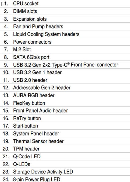 | Прочие внутренние элементы | 24-контактный разъем питания ATX 2 8-контактных разъема питания EPS12V 1 слот M.2 (E-key), занят адаптером беспроводных сетей 1 разъем для подключения порта USB 3.2 Gen2x2 Type-C 2 разъема для подключения 4 портов USB 3.2 Gen1 2 разъема для подключения 4 портов USB 2.0 8 разъемов для подключения 4-контактных вентиляторов и помп ЖСО 1 разъем для подключения неадресуемой RGB-ленты 3 разъема для подключения адресуемой ARGB-ленты 1 разъем аудио для передней панели корпуса 1 кнопка OC Retry 1 разъем TPM для устройств безопасности 1 разъем для термодатчика 3 разъема подключения фирменных помп СВО Asus 2 разъема для подключения управления с передней панели корпуса 1 кнопка включения питания Power 1 кнопка перезагрузки Reset |