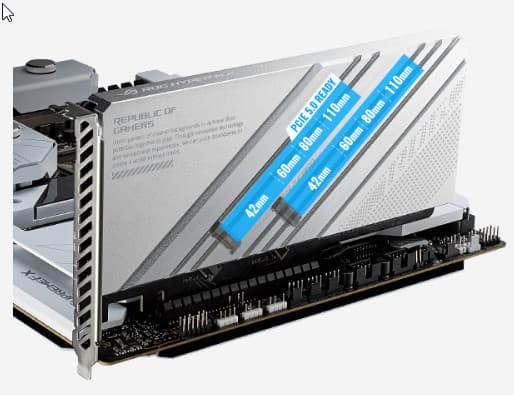 - Переключатель: или слот PCIe x16_3 (4 линии) под любые нужды, или слот PCIe x16_3 вместе с ROG M.2 Card (2 слота М.2 по 4 линии): максимум 8 линий PCIe 4.0;
