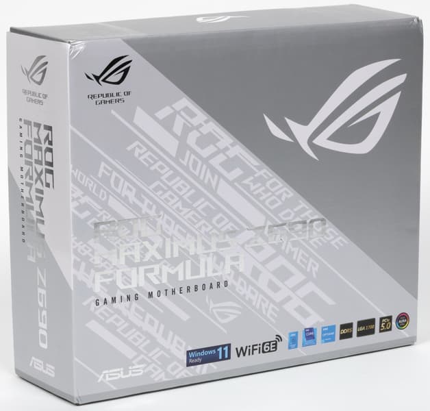 Asus ROG Maximus Z690 Formula поставляется в традиционной толстой коробке фирменного дизайна серии ROG, однако уже не черно-красных, а серо-белых тонов, подчеркивая особенность дизайна платы, имеющей белые радиаторы охлаждения. Комплект размещен под платой в отдельном отсеке.