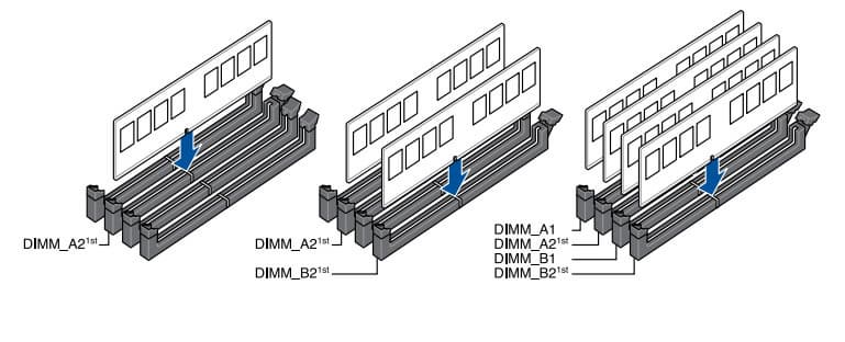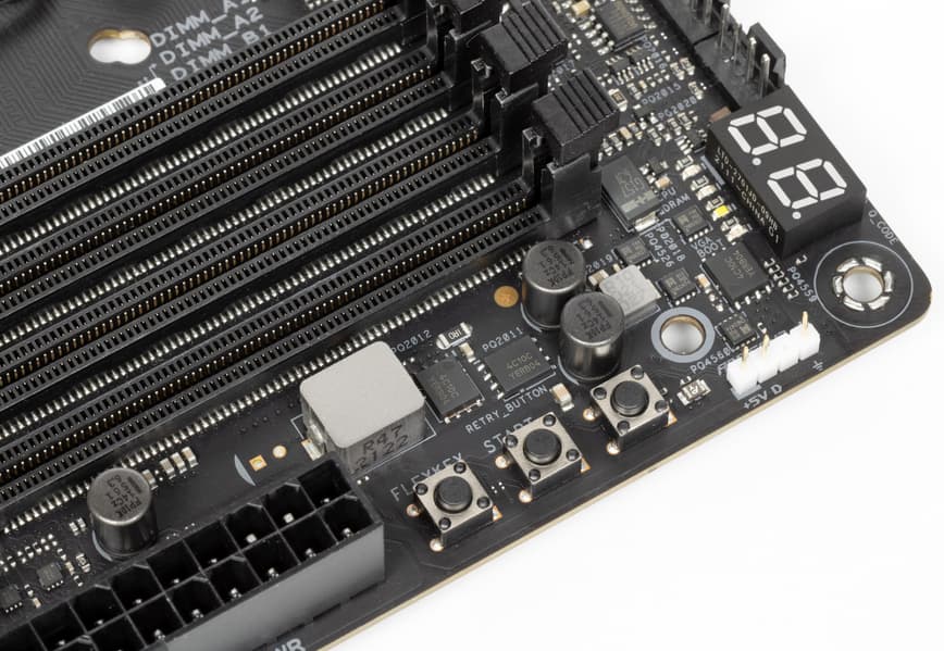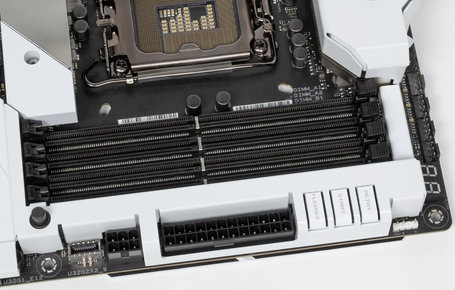Для установки модулей памяти на плате Asus имеется четыре DIMM-слота (для работы памяти в Dual Channel в случае использования всего 2 модулей их следует устанавливать в А2 и B2. Плата поддерживает небуферизованную память DDR5 (non-EСС), а максимальный объем памяти составляет 128 ГБ. Разумеется, поддерживаются профили XMP.