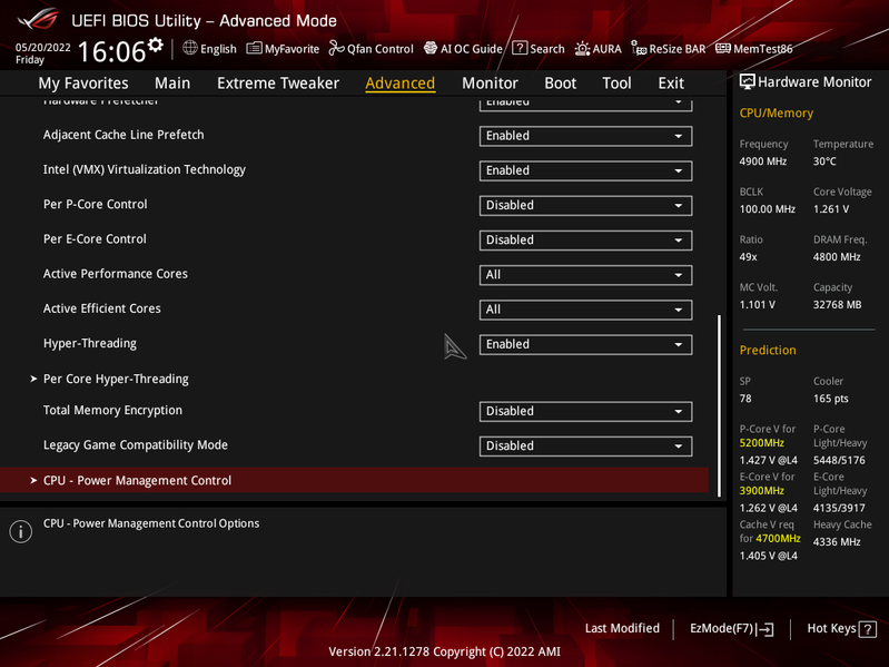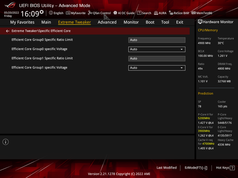 Разумеется, получили уже стандартные значения авторазгона: 4.9 ГГц по всем P-ядрам, и 3.7 ГГц по всем Е-ядрам. Напомню, что Р-ядра — это обычные всем привычные ядра, имеющие по 2 потока каждый, «Р» — означает Performance, то есть производительные. «Е» — это энергоэффективные ядра, так называемые, малые ядра, у них по 1 потоку. В который раз мы видим, что система по умолчанию, определив очень мощное питание матплаты, выставила данный авторазгон. Думаю, что такой результат у всех матплат с приличной системой питания (совместно с i9-12900K).
