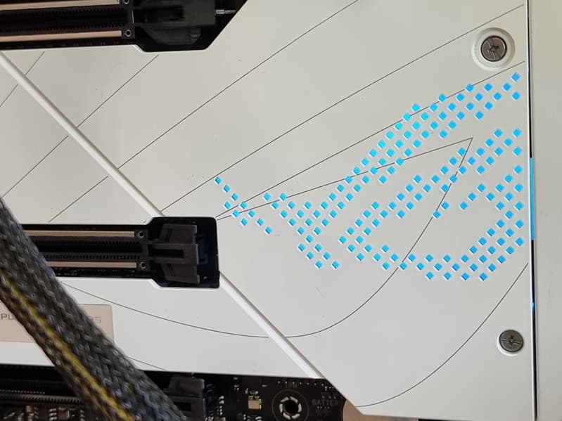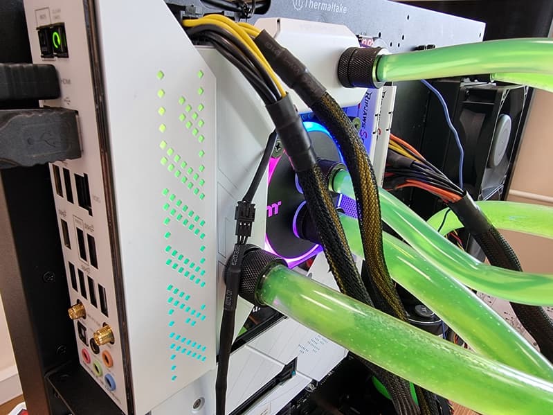 Радиатор VRM, идущий вдоль заднего блока портов, имеет кожух, прикрывающий тот самый блок, оснащенный подсветкой.