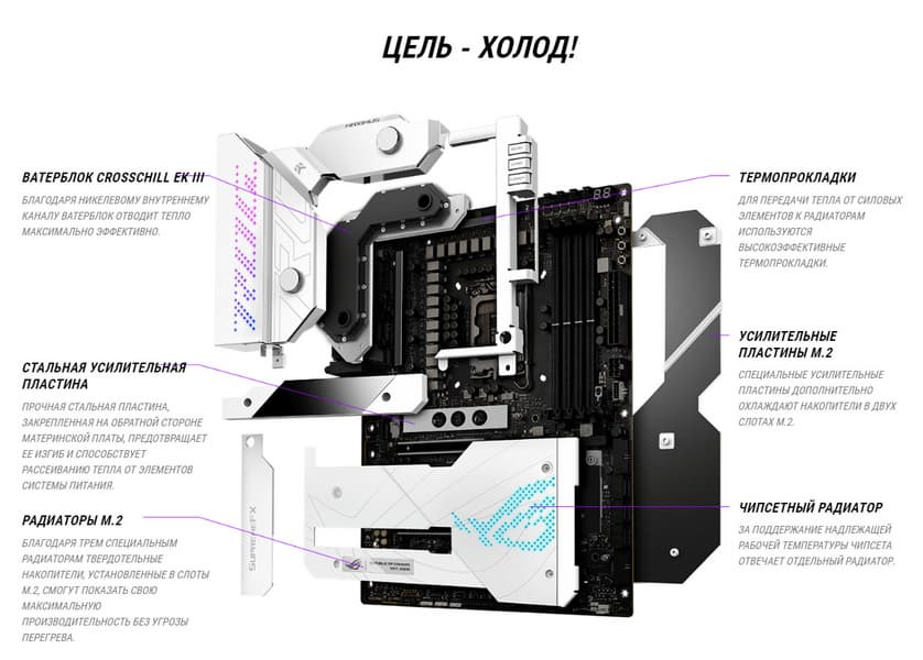 Данная матплата уникальна тем, что кроме обычных и всем привычных радиаторов охлаждения для элементов VRM имеется водоблок, выполненный компанией EK по заказу Asus.
