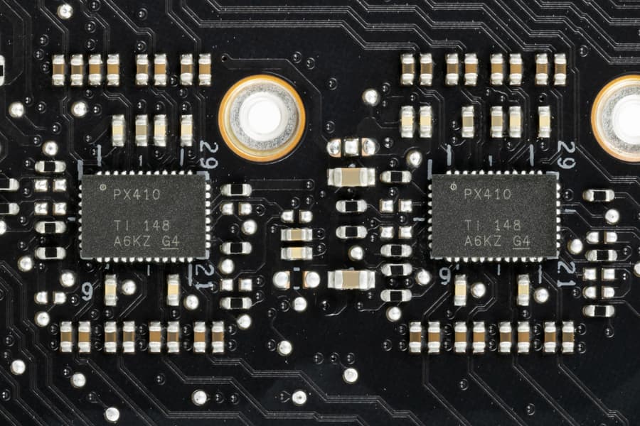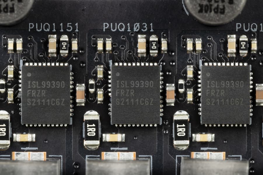 Каждый канал фазы имеет суперферритовый дроссель и ISL99390 MOSFET от Renesas (ex-Intersil) на 90 А.