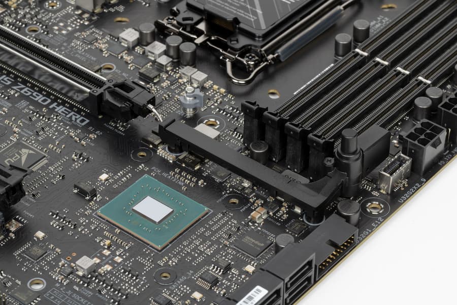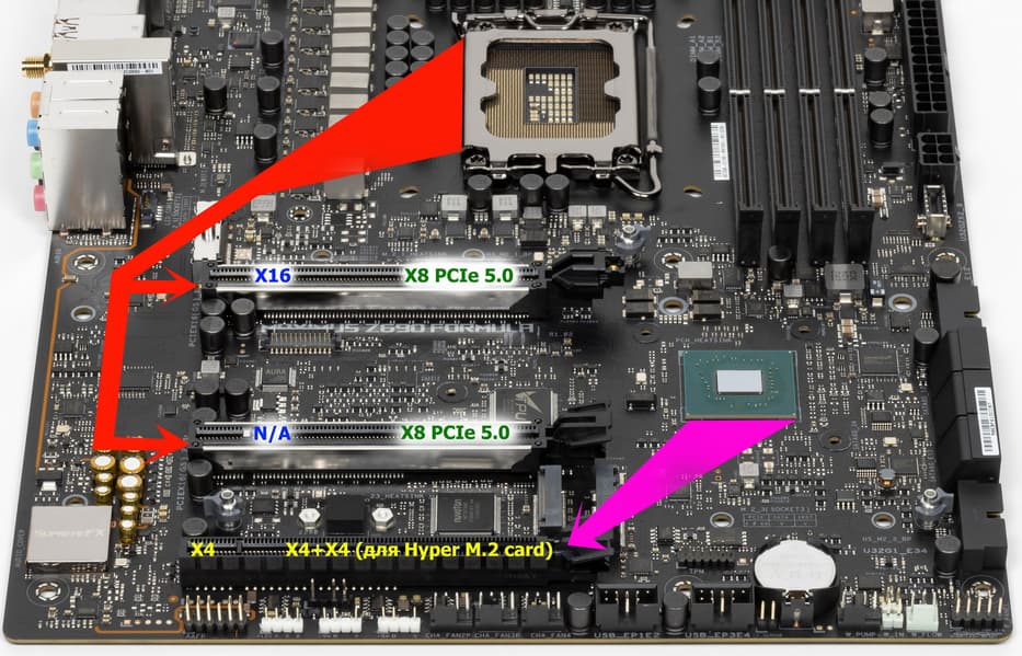 Всего на плате есть 3 слота: два PCIe x16 (для видеокарт или других устройств) и один PCIe x16 (но фактически имеющий 8 линий). Если про первые два PCIe x16 я выше уже рассказал (они подключены к CPU), то PCIe x16_3 подключен к Z690, и тут есть один очень важный момент.