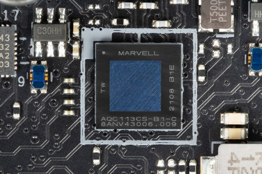 Материнская плата оснащена средствами связи хорошо. Имеется очень скоростной Ethernet-контроллер Marvel AQC113, способный работать по стандарту 10 Гбит/с.