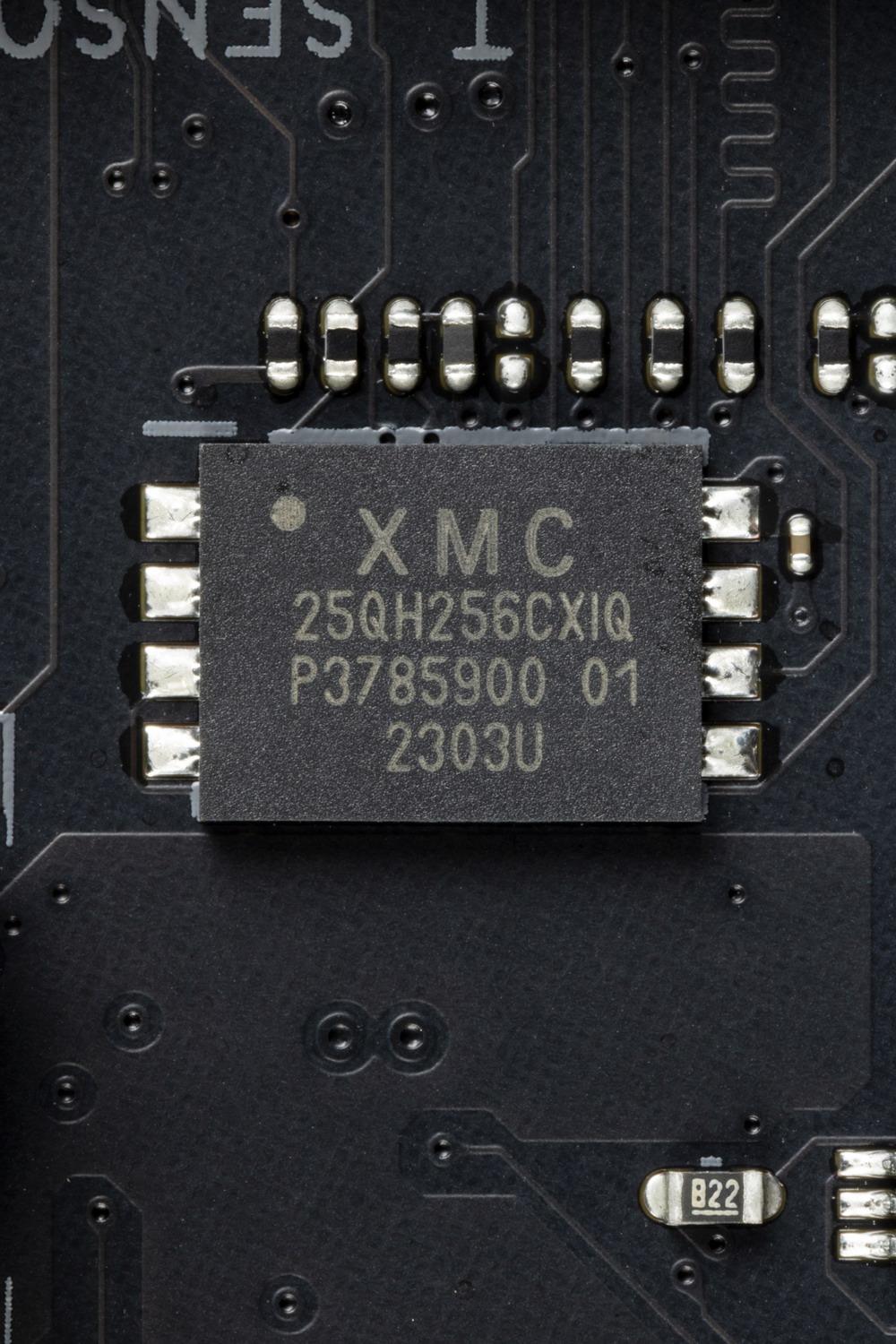 На оборотной стороне расположено несколько контроллеров и традиционная некоторая логика. Текстолит обработан хорошо: во всех точках пайки не только острые концы срезаны, но и все неплохо отшлифовано. На задней стороне установлена пластина из алюминия с наноуглеродным покрытием. Она помогает отводить тепло от задней стороны PCB через термоинтерфейс и обеспечивает жесткость материнской платы.