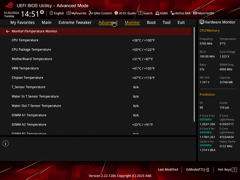 Уже весьма стандартно для топовых матплата мы получили 5,7 ГГц по всем P-ядрам, и 4,4 ГГц по всем Е-ядрам при автоматическом разгоне. Напомню, что Р-ядра — это обычные всем привычные ядра, имеющие по 2 потока каждый, «Р» — означает Performance, то есть производительные. «Е» — это энергоэффективные ядра, так называемые, малые ядра, у них по 1 потоку. Все параметры системы по нагреву компонентов были в норме.