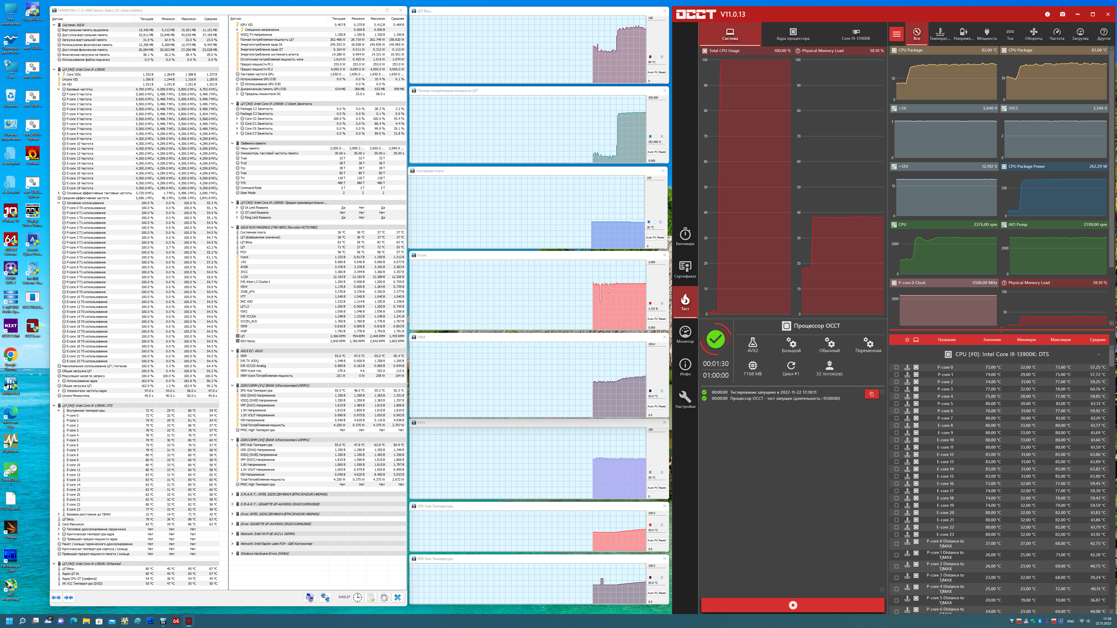 Ну что же, весьма неплохо! В режиме авторазгона мы получили 5.5 ГГц по всем P-ядрам, и 4.3 ГГц по всем Е-ядрам! Напомню, что Р-ядра — это обычные всем привычные ядра, имеющие по 2 потока каждый, «Р» — означает Performance, то есть производительные. «Е» — это энергоэффективные ядра, так называемые, малые ядра, у них по 1 потоку. В целом мы видим, что система по умолчанию, определив очень мощное питание матплаты, выставила очень приличный авторазгон. Все остальные параметры системы по нагреву компонентов были в норме. И стоит отметить, что потребление CPU уже перевалило за 260 Вт!