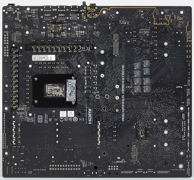 Форм-фактор ATX имеет размеры до 305×244 мм, а E-ATX — до 305×330 мм. Материнская плата Asus ROG Maximus Z890 Extreme имеет размеры 305×277 мм, поэтому выполнена в форм-факторе E-ATX, и на ней имеются 9 монтажных отверстий для установки в корпус. Однако следует иметь в виду, что два из девяти монтажных отверстий перекрыты радиаторами охлаждения.