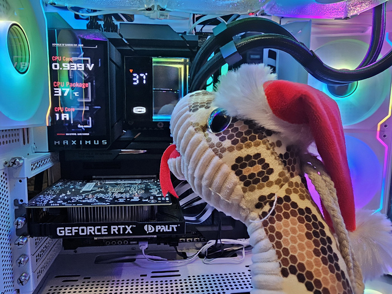 В арсенале платы также есть 4 порта SATA и 8 разъемов для вентиляторов. Система питания процессора очень и очень мощная, способная обеспечить работу любых совместимых процессоров с приличным запасом на разгон. Плата имеет грамотную систему охлаждения каждого потенциально греющегося элемента, включая накопители в слотах M.2 (термопрокладки для охлаждения накопителей в 4 слотах на самой плате есть с обеих сторон). Сетевые возможности прекрасные: два быстрых проводных контроллера (10 и 2,5 Гбит/с) и один самый современный беспроводной — Wi-Fi 7 + Bluetooth 5.4. В числе плюсов платы можно упомянуть наличие большого ЖК-экрана (с выводом на него данных мониторинга или собственных анимаций и картинок), а также широкие возможности для подключения дополнительных RGB-устройств.