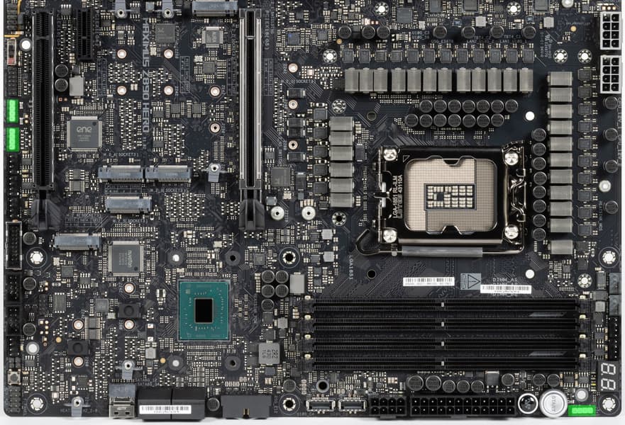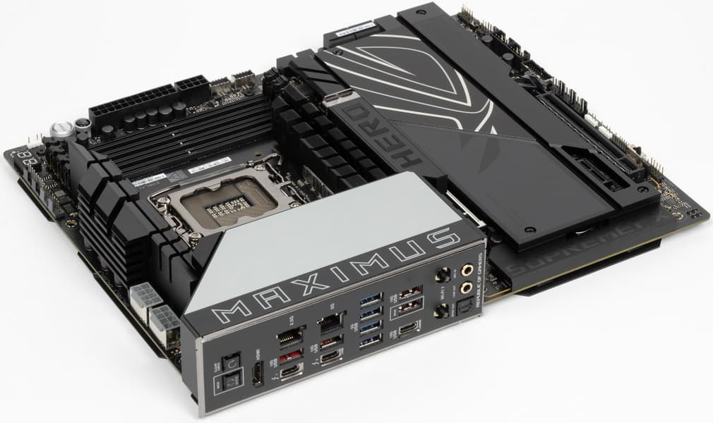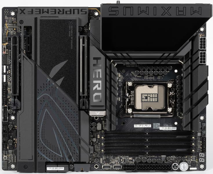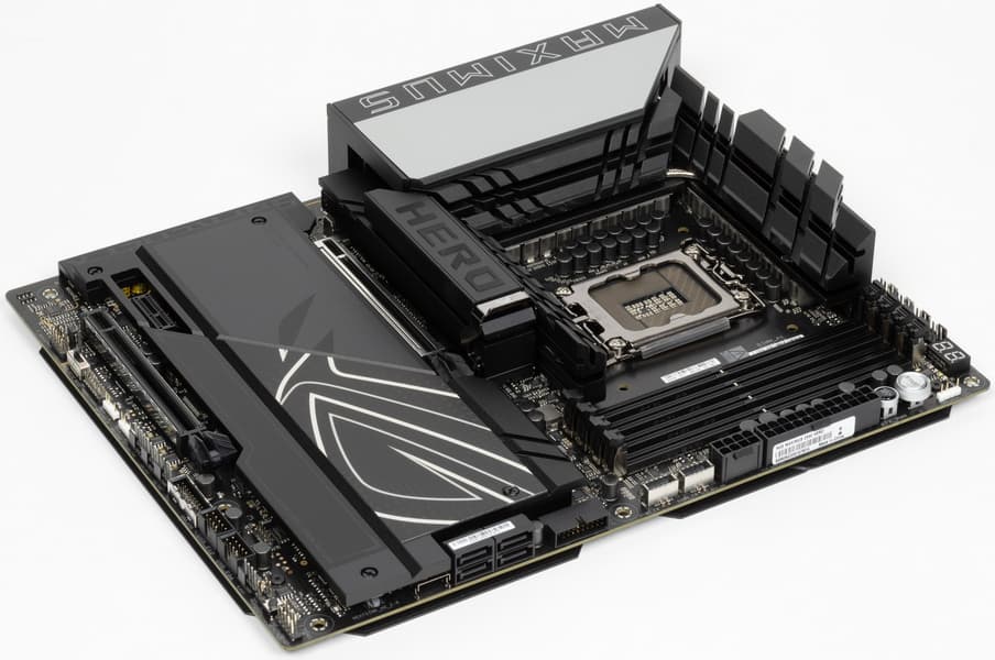 Третьей материнской платой на новом чипсете Z890 и с новым процессорным сокетом LGA1851, попавшей к нам в лабораторию, стал продукт компании Asus, а именно Asus ROG Maximus Z890 Hero. Эта матплата относится к топовому суббренду ROG, причем входит во флагманскую серию Maximus, поэтому перед нами почти флагман (мы помним, что самая-самая в этой линейке — материнка c суффиксом Extreme, а Hero — на ступень ниже).
