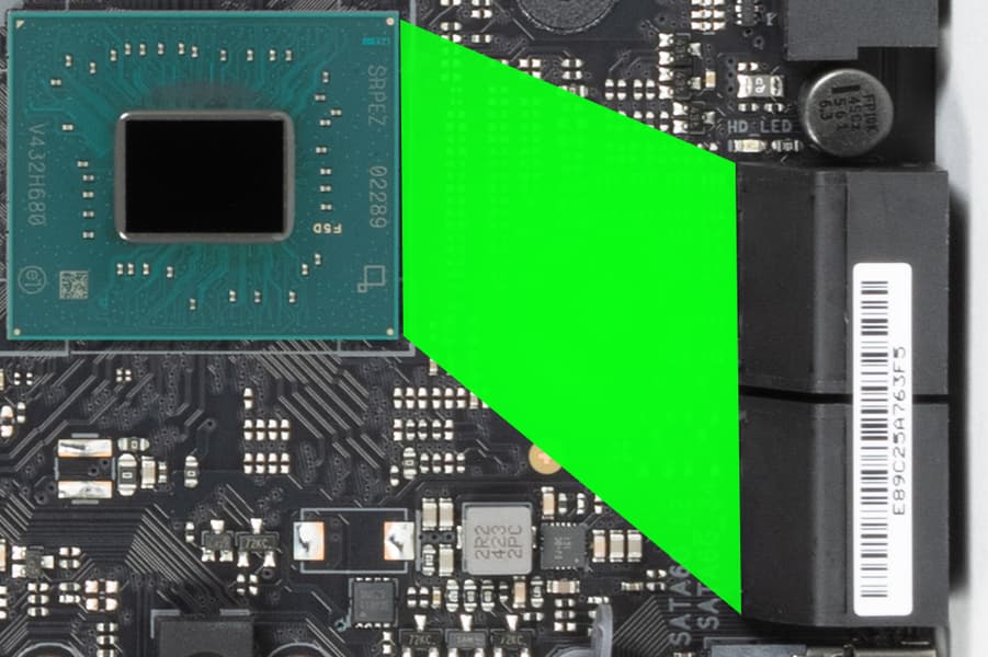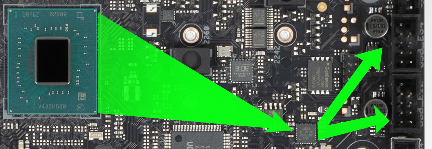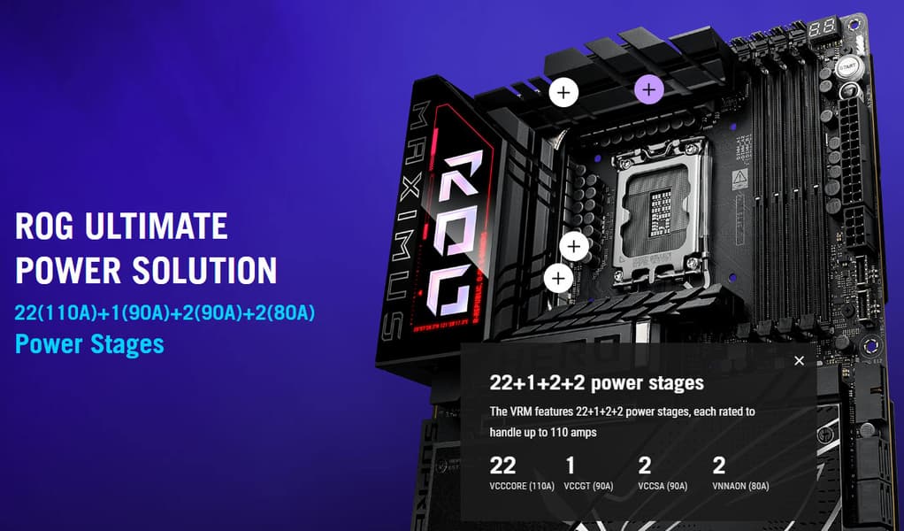 Схема питания процессора выполнена по схеме 22+1+2+2 (всего 27 фаз: 22 на VCore (ядро процессора), 1 на iGPU (интегрированное графическое ядро), 2 на VCCSA (System Agent, кольцевая шина) и 2 на VNNAON (управление энергосбережением).