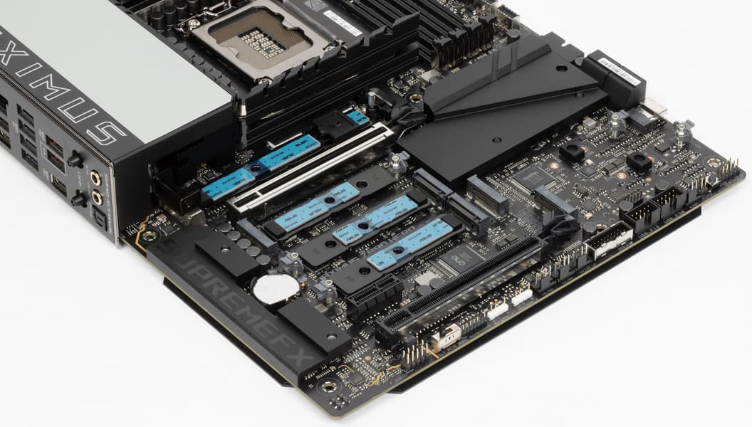 Пятый и шестой слоты M.2 (M.2_5, M.2_6) получают данные от чипсета Z890, а первые четыре — от CPU, при этом M.2_3 и M.2_4 получают PCIe 5.0, деля ресурсы со слотом PCIe x16_1 (о чем я уже выше рассказывал), M.2_1 штатно получает от процессора PCIe 5.0, а M.2_2 получает от процессора PCIe 4.0.