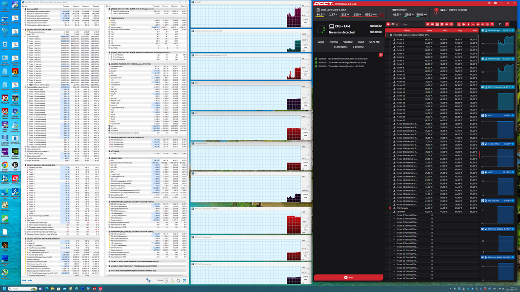 А теперь давайте-ка вспомнил былые режимы, тесты и включим MCE на полную, чтобы снять лимиты, но оставив все наборы частот и вольтажы на автоматическом режиме. Ну как-то видно, что частоты подросли, уже ощутимо, потребление CPU вышло за пределы 210 Вт (безусловно, это все еще сильно меньше, чем «кушал» 14900K в подобном режиме). Производительность также выросла, но +3%... Кхм.