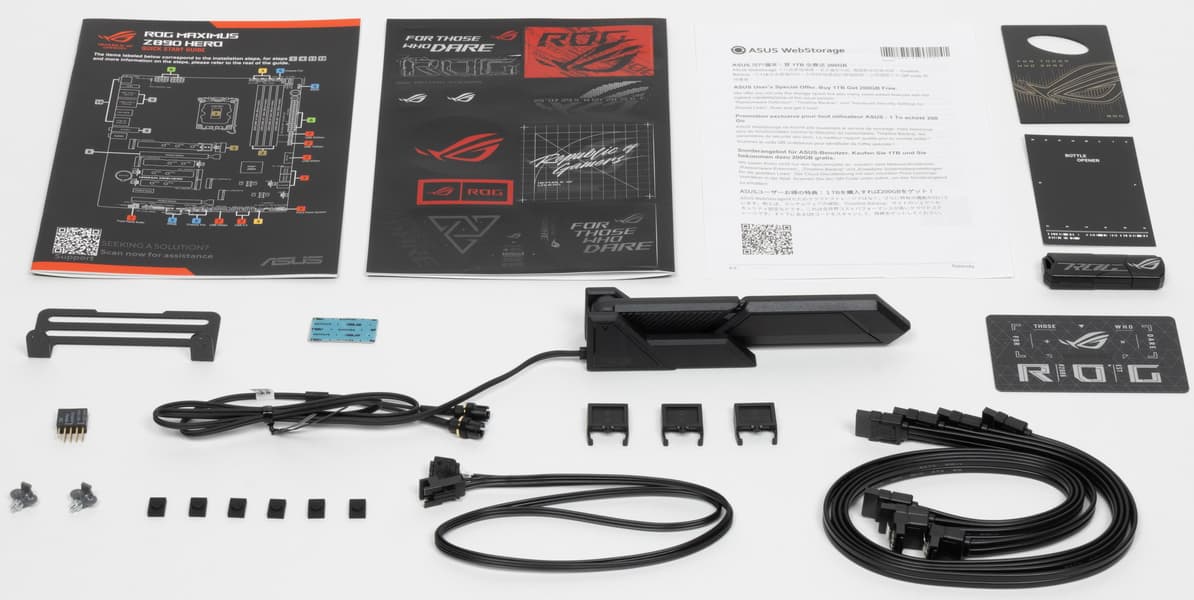 Надо отметить, что комплект поставки весьма приятный: кроме традиционных элементов типа руководства пользователя и кабелей SATA, имеются антенна встроенного Wi-Fi-модуля, фирменный адаптер для передней панели, бонусные стикеры, запасные держатели накопителей в слотах M.2, адаптер для подключения внешней подсветки, держатель дополнительного вентилятора для охлаждения модулей памяти (сам вентилятор приобретается отдельно), членская карточка клуба ROG, сувенирная открывалка бутылок и накопитель типа Flash-drive с ПО.