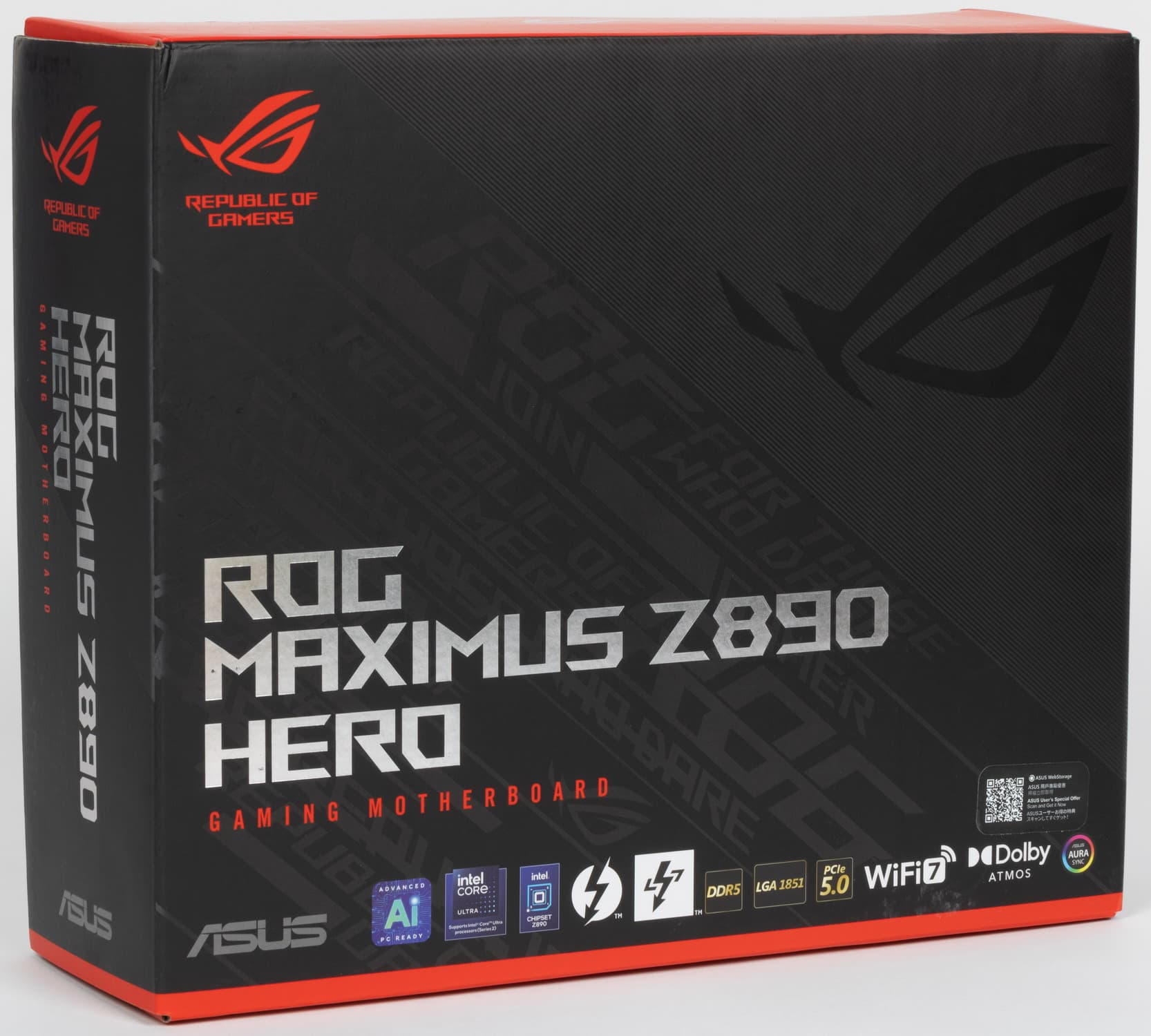 Asus ROG Maximus Z890 Hero поставляется в традиционной коробке фирменного черно-красного дизайна серии ROG. Комплект размещен под платой в отдельных отсеках.
