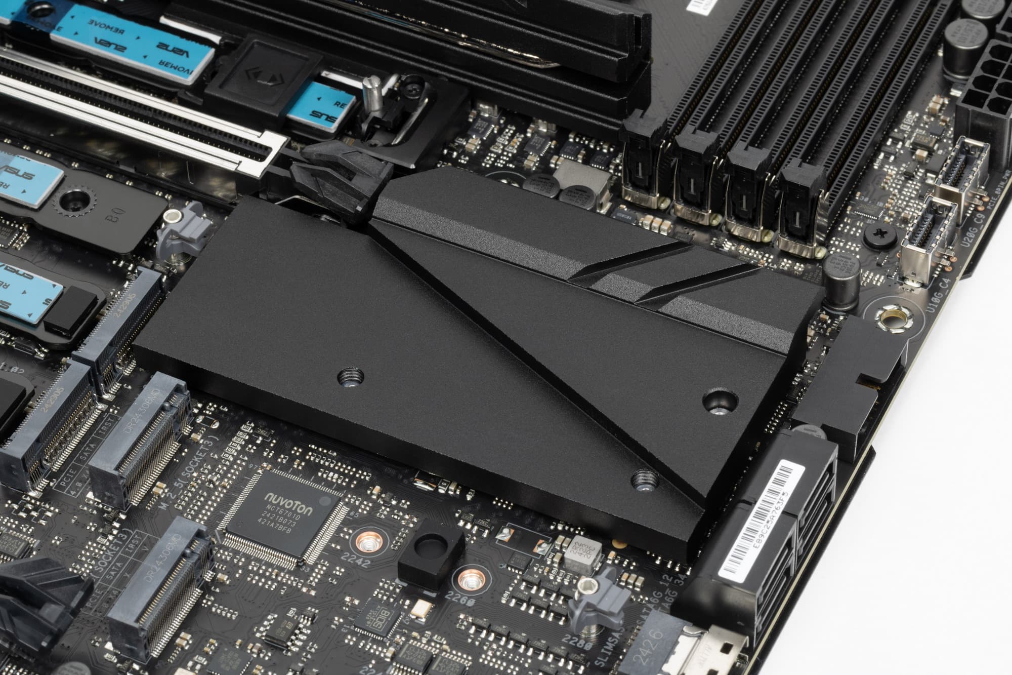 Как я уже упоминал ранее, M.2 слоты также имеют радиаторы: у верхнего — свой персональный радиатор, у остальных — общий.