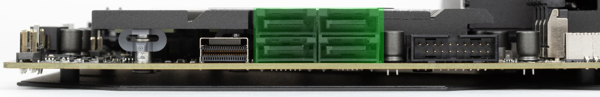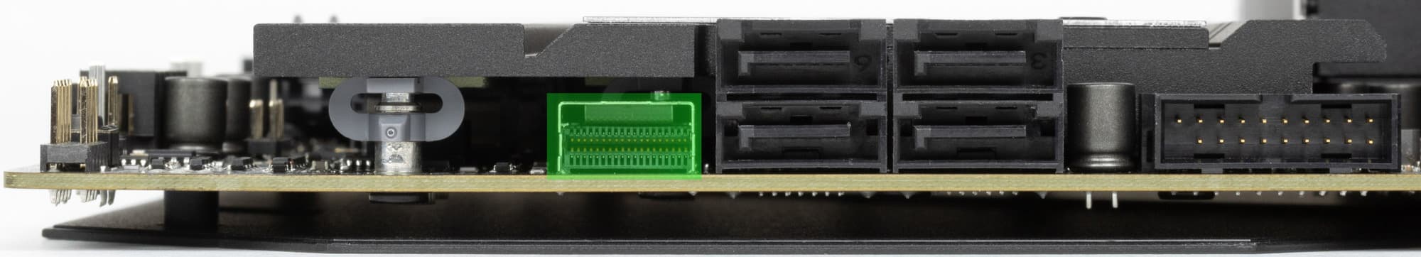 Рядом с ними имеется и относительно новый и редко встречающийся порт SlimSAS – это сверхскоростное соединение, обычно применяемое в серверах и устройствах хранения данных. SAS – последовательный единый интерфейс (Serial Attached SCSI) для подключения разных устройств хранения данных. SlimSAS – это мини-версия данного порта. В данном случае SlimSAS поддерживает подключение еще одного NVMe накопителя PCIe 4.0 x4, либо 4х портов SATA. Интерфейсные кабели для таких целей приобретаются отдельно.