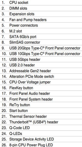 | Прочие внутренние элементы | 24-контактный разъем питания ATX 2 8-контактный разъем питания EPS12V 1 8-контактный разъем питания PCIe 1 слот M.2 (E-key), занят адаптером беспроводных сетей 1 разъем для подключения порта USB 3.2 Gen2x2 Type-C 1 разъем для подключения порта USB 3.2 Gen2 Type-C 2 разъема для подключения 4 портов USB 3.2 Gen1 2 разъема для подключения 4 портов USB 2.0 8 разъемов для подключения 4-контактных вентиляторов и помп ЖСО 3 разъема для подключения адресуемой ARGB-ленты 1 разъем аудио для передней панели корпуса 1 переключатель версии PCIe Alt_PCI_mode 2 разъем для термодатчиков 1 переключатель CPU_OV для снятия лимита по напряжению на CPU 1 разъем для подключение дискретных карт Thunderbolt4 1 кнопка Retry для повтора запуска системы при оверклокинге 1 разъем для подключения управления с передней панели корпуса 1 кнопка включения питания Power 1 конфигурируемая кнопка перезагрузки FlexKey |
