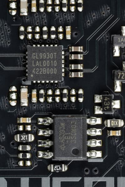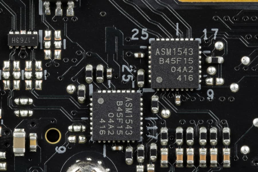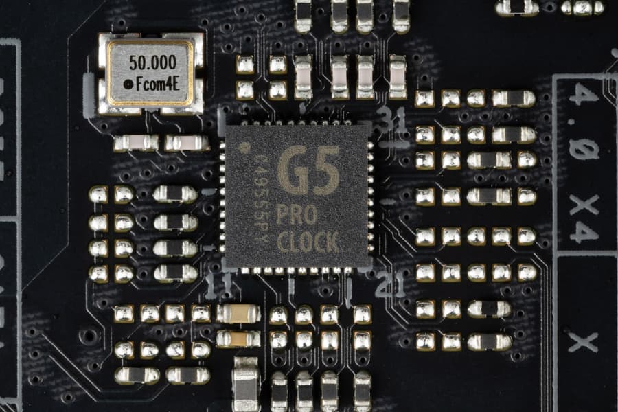 Для более стабильной работы на матплате имеются усилители (ре-драйверы) сигнала PCIe 4.0 от Genesys Logic.