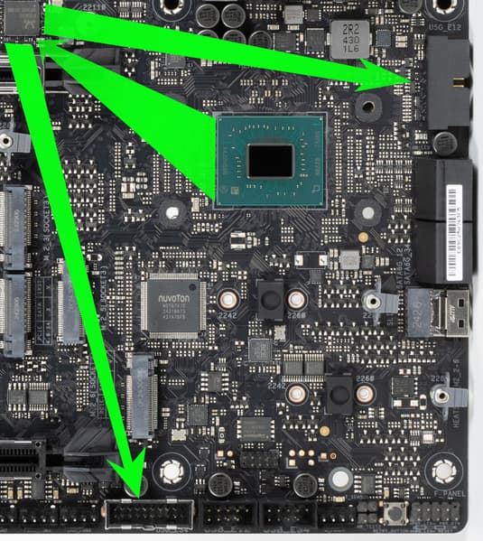 Через ПО или BIOS контролируется все гнезда для подключения воздушных вентиляторов или помп: они могут управляться как через ШИМ, так и банальным изменением напряжения/тока (семь гнезд (отмечены зеленым цветом) рассчитаны на максимальный ток 2А и потребление до 24 Вт, а одно гнездо для помпы кастомной СЖО – до 3А и 36 Вт (отмечено голубым цветом).
