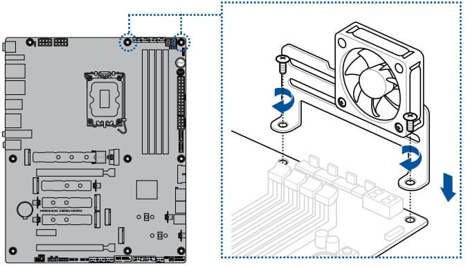 Одной из особенностей новой платформы Intel является поддержка современной памяти DDR5 в в виде CUDIMM. Цель этих новаций – достижение более высоких тактовых частот работы, а значит и нагрев модулей памяти может вырасти. Поэтому в комплекте поставки матплаты имеется дополнительный кронштейн для крепления вентилятора 40-60 мм, устанавливаемый на верхнем торце платы рядом со слотами ОЗУ. Вентилятор приобретается отдельно.