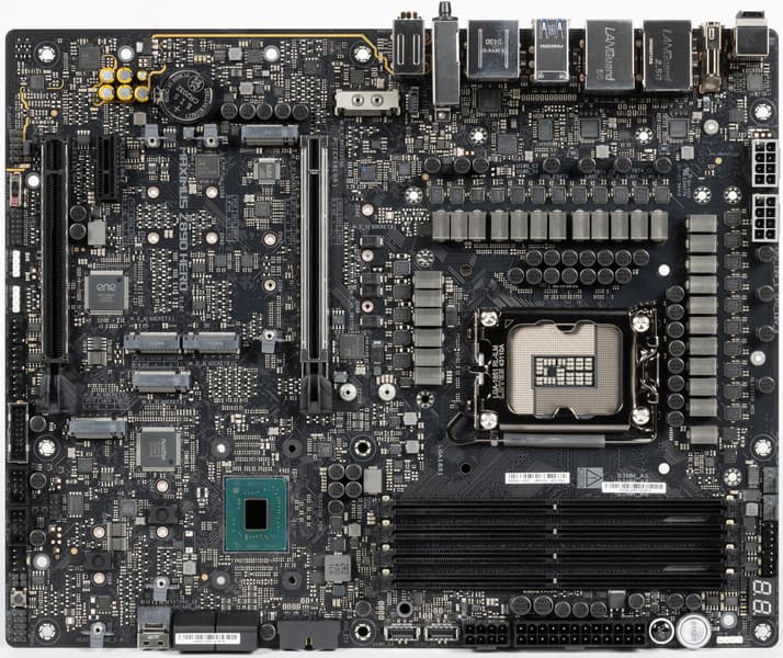 У нее имеется 21 порт USB разных видов, включая 2 самых быстрых USB4, один USB 3.2 Gen2×2 в виде внутреннего порта Type-C и 6 USB 3.2 Gen2. Также плата предлагает 2 слота PCIe х16, один из которых получает от процессора 16 линий PCIe 5.0, а другой работает в режиме x4 (подключен к чипсету), имеется и слот PCIe x1. У платы аж 6 слотов M.2, 4 из которых подключены напрямую к процессору: один — линиями PCIe 4.0, второй — линиями PCIe 5.0, а третий и четвертый делят линии PCIe 5.0 со слотом PCIe x16, вынуждая последний переходить в режим х8. Два других слота М.2 подключены к чипсету Z890 линиями PCIe 4.0.